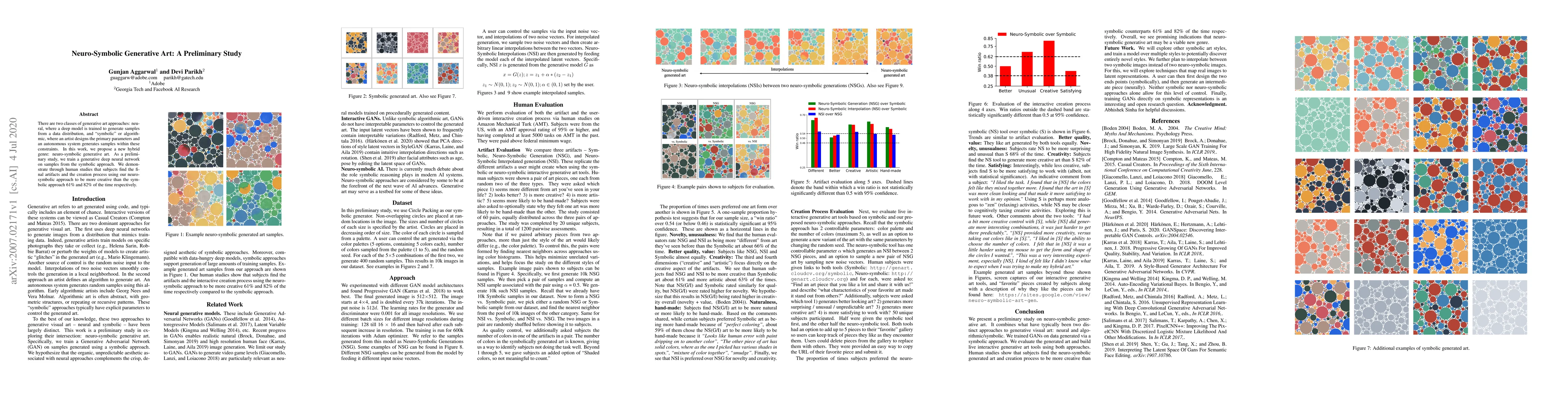 There are two classes of generative art approaches: neural, where a deep model is trained to generate samples from a data distribution, and symbolic or algorithmic, where an artist designs the primary parameters and an autonomous system generates samples within these constraints. In this work, we propose a new hybrid genre: neuro-symbolic generative art. As a preliminary study, we train a generative deep neural network on samples from the symbolic approach. We demonstrate through human studies that subjects find the final artifacts and the creation process using our neuro-symbolic approach to be more creative than the symbolic approach 61% and 82% of the time respectively.