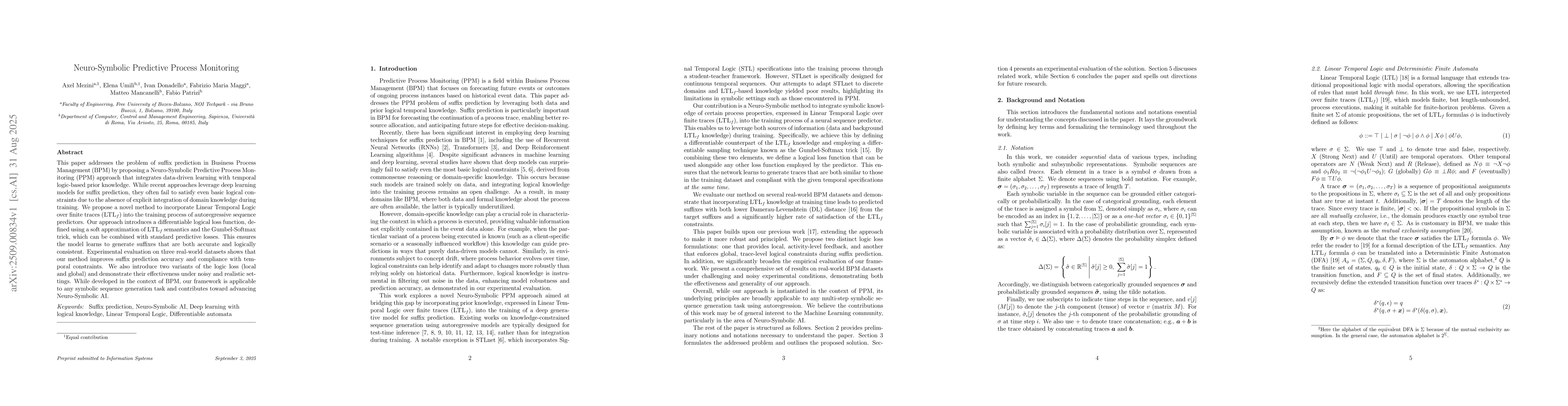 This paper addresses the problem of suffix prediction in Business Process Management (BPM) by proposing a Neuro-Symbolic Predictive Process Monitoring (PPM) approach that integrates data-driven learning with temporal logic-based prior knowledge. While recent approaches leverage deep learning models for suffix prediction, they often fail to satisfy even basic logical constraints due to the absence of explicit integration of domain knowledge during training. We propose a novel method to incorporate Linear Temporal Logic over finite traces (LTLf) into the training process of autoregressive sequence predictors. Our approach introduces a differentiable logical loss function, defined using a soft approximation of LTLf semantics and the Gumbel-Softmax trick, which can be combined with standard predictive losses. This ensures the model learns to generate suffixes that are both accurate and logically consistent. Experimental evaluation on three real-world datasets shows that our method improves suffix prediction accuracy and compliance with temporal constraints. We also introduce two variants of the logic loss (local and global) and demonstrate their effectiveness under noisy and realistic settings. While developed in the context of BPM, our framework is applicable to any symbolic sequence generation task and contributes toward advancing Neuro-Symbolic AI.