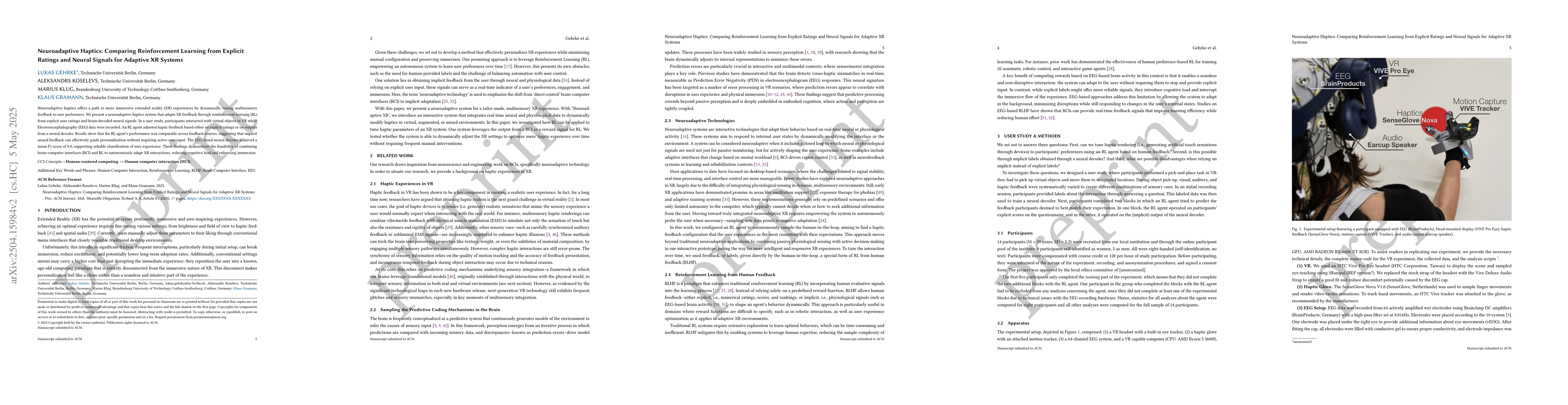 The paper introduces a neuroadaptive haptics system that leverages RL for personalizing XR experiences using both explicit user ratings and implicit neural signals, demonstrating the feasibility of combining BCI and RL for autonomous adaptation.
