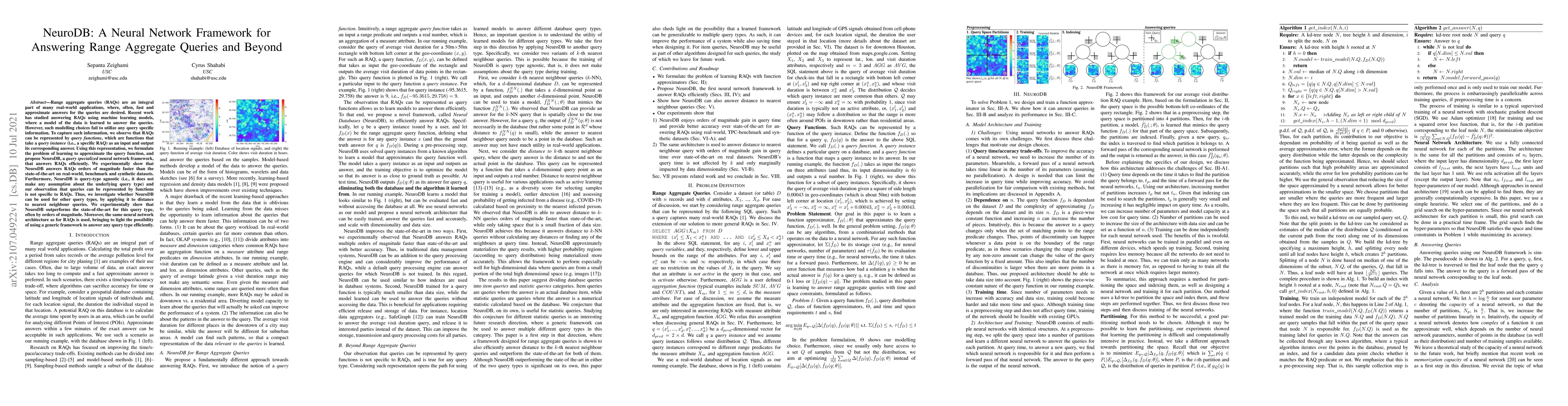 NeuroDB is a specialized neural network framework designed to efficiently answer range aggregate queries (RAQs) by learning query functions. It demonstrates superior performance over state-of-the-art methods for RAQs and extends its applicability to other query types, such as distance to nearest neighbor queries, showcasing its potential as a generic framework for efficient query answering.
