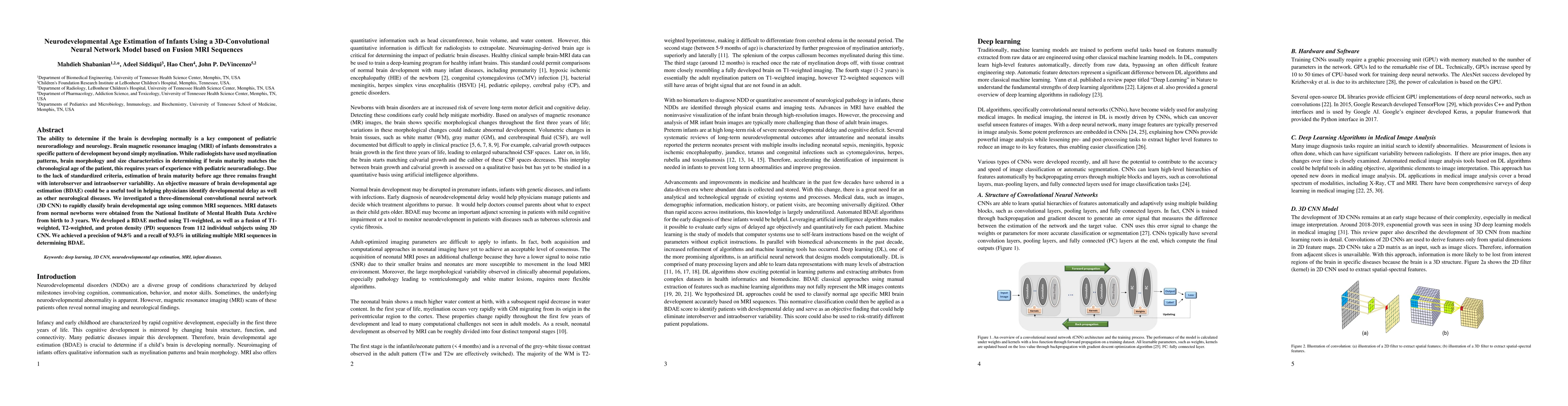This study developed a 3D convolutional neural network model to estimate brain developmental age in infants using fusion MRI sequences, achieving high precision and recall, which could aid in identifying developmental delays and neurological diseases. The method uses T1, T2, and PD MRI sequences to provide an objective measure of brain maturity.