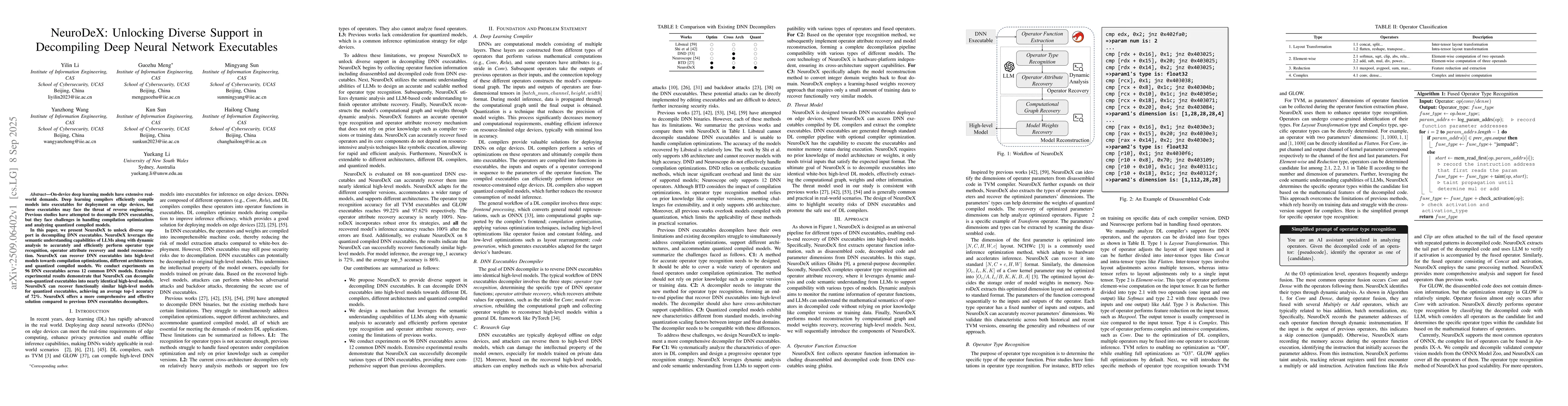 On-device deep learning models have extensive real world demands. Deep learning compilers efficiently compile models into executables for deployment on edge devices, but these executables may face the threat of reverse engineering. Previous studies have attempted to decompile DNN executables, but they face challenges in handling compilation optimizations and analyzing quantized compiled models. In this paper, we present NeuroDeX to unlock diverse support in decompiling DNN executables. NeuroDeX leverages the semantic understanding capabilities of LLMs along with dynamic analysis to accurately and efficiently perform operator type recognition, operator attribute recovery and model reconstruction. NeuroDeX can recover DNN executables into high-level models towards compilation optimizations, different architectures and quantized compiled models. We conduct experiments on 96 DNN executables across 12 common DNN models. Extensive experimental results demonstrate that NeuroDeX can decompile non-quantized executables into nearly identical high-level models. NeuroDeX can recover functionally similar high-level models for quantized executables, achieving an average top-1 accuracy of 72%. NeuroDeX offers a more comprehensive and effective solution compared to previous DNN executables decompilers.