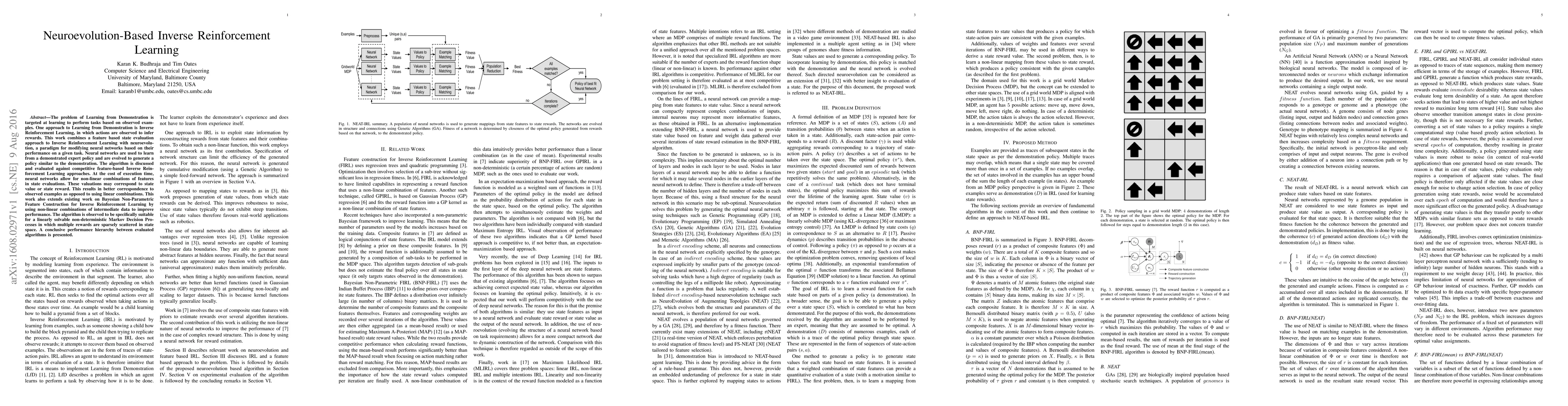 This paper proposes a neuroevolution-based approach to Inverse Reinforcement Learning, combining neural networks with neuroevolution to learn and evolve policies from demonstrated expert behavior. The method shows improved performance over linear feature-based approaches, especially in non-deterministic Markov Decision Processes with sparse rewards.