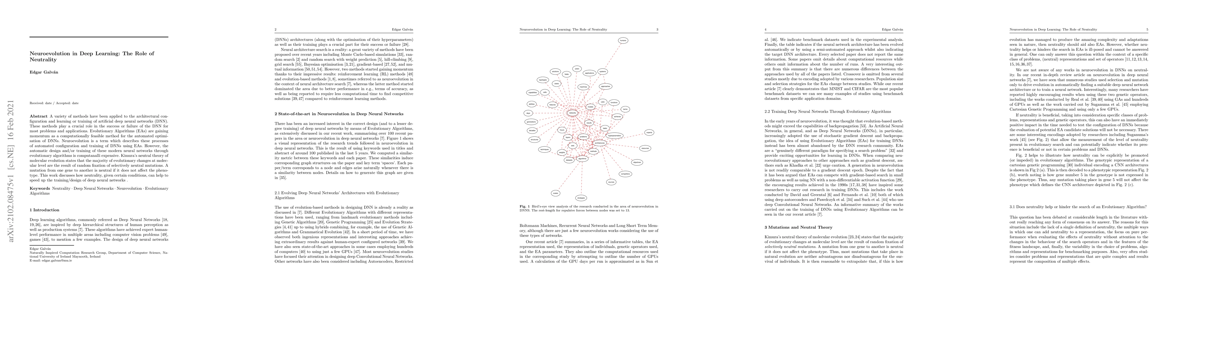 A variety of methods have been applied to the architectural configuration and learning or training of artificial deep neural networks (DNN). These methods play a crucial role in the success or failure of the DNN for most problems and applications. Evolutionary Algorithms (EAs) are gaining momentum as a computationally feasible method for the automated optimisation of DNNs. Neuroevolution is a term which describes these processes of automated configuration and training of DNNs using EAs. However, the automatic design and/or training of these modern neural networks through evolutionary algorithms is computanalli expensive. Kimura's neutral theory of molecular evolution states that the majority of evolutionary changes at molecular level are the result of random fixation of selectively neutral mutations. A mutation from one gene to another is neutral if it does not affect the phenotype. This work discusses how neutrality, given certain conditions, can help to speed up the training/design of deep neural networks.