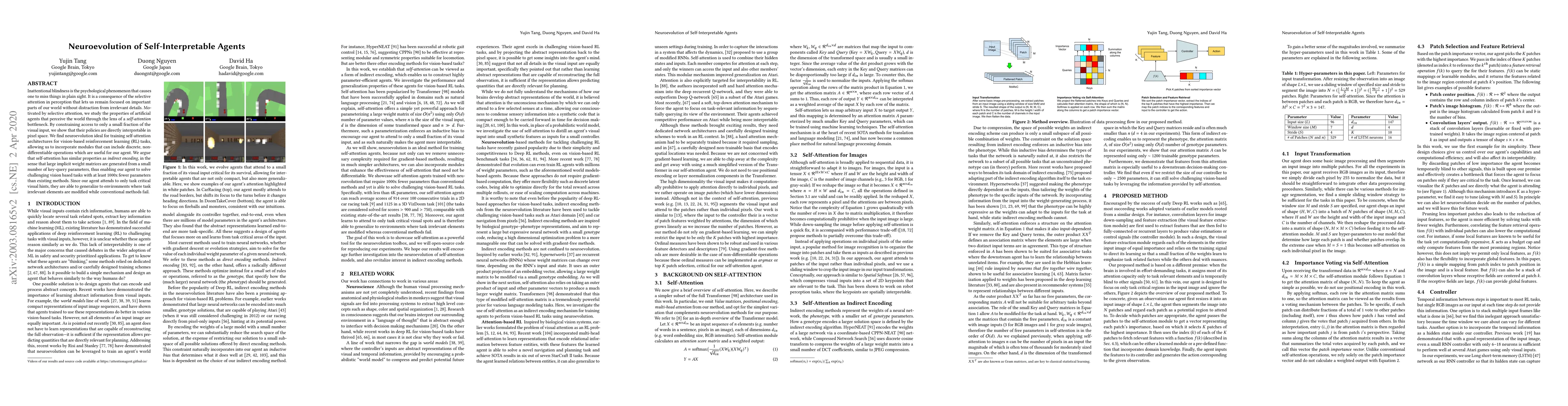 Inattentional blindness is the psychological phenomenon that causes one to miss things in plain sight. It is a consequence of the selective attention in perception that lets us remain focused on important parts of our world without distraction from irrelevant details. Motivated by selective attention, we study the properties of artificial agents that perceive the world through the lens of a self-attention bottleneck. By constraining access to only a small fraction of the visual input, we show that their policies are directly interpretable in pixel space. We find neuroevolution ideal for training self-attention architectures for vision-based reinforcement learning (RL) tasks, allowing us to incorporate modules that can include discrete, non-differentiable operations which are useful for our agent. We argue that self-attention has similar properties as indirect encoding, in the sense that large implicit weight matrices are generated from a small number of key-query parameters, thus enabling our agent to solve challenging vision based tasks with at least 1000x fewer parameters than existing methods. Since our agent attends to only task critical visual hints, they are able to generalize to environments where task irrelevant elements are modified while conventional methods fail. Videos of our results and source code available at https://attentionagent.github.io/
