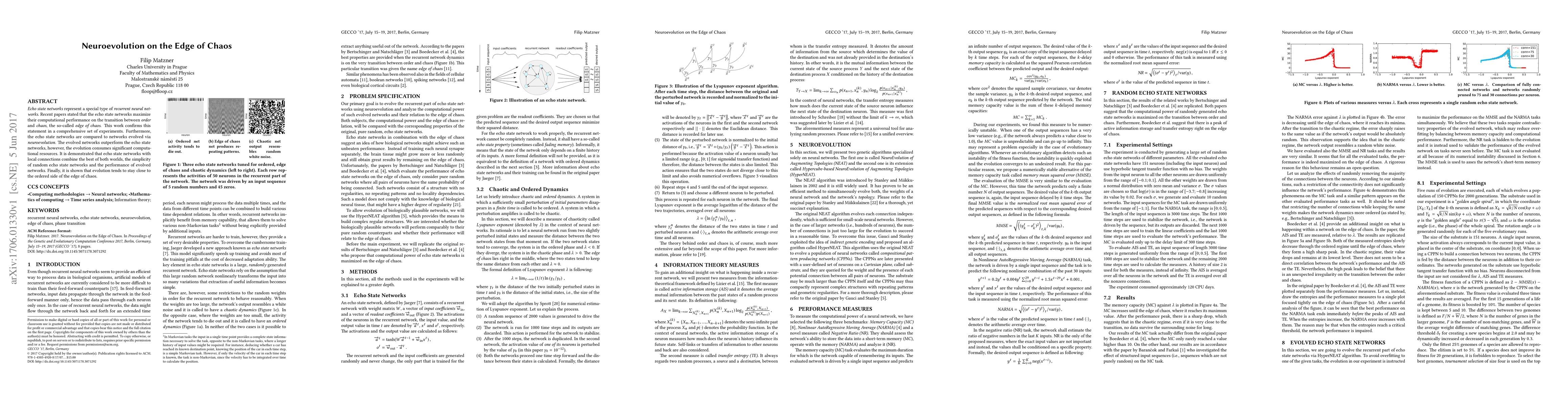 This paper investigates echo state networks' performance on the edge of chaos and compares them to neuroevolution-based networks. It finds that while evolved networks outperform standard echo state networks, they require significant computational resources, whereas local echo state networks offer a balance of simplicity and performance.