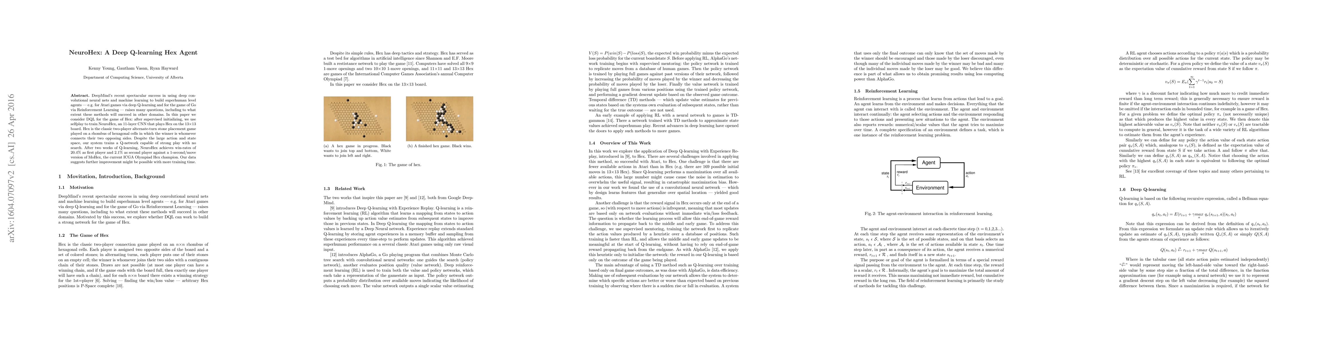 NeuroHex employs deep Q-learning and an 11-layer CNN to play the game of Hex, achieving a win-rate of 20.4% against a top human-level opponent, demonstrating the potential of reinforcement learning in complex board games. Further training may enhance its performance.