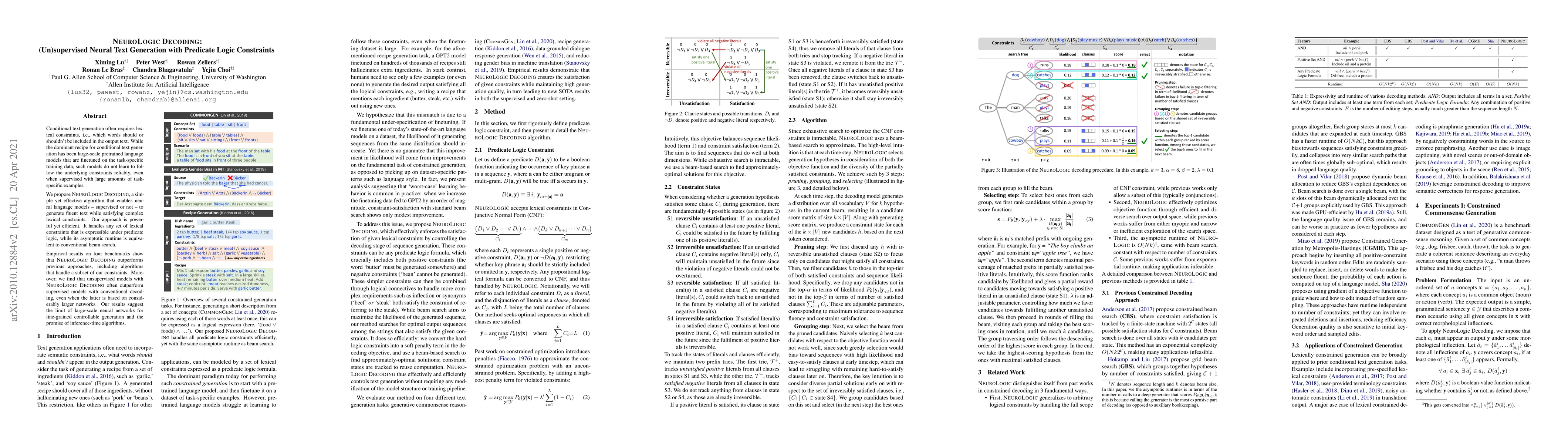 NeuroLogic Decoding is a novel algorithm that allows neural language models to generate text while adhering to complex lexical constraints expressed in predicate logic. It outperforms previous methods across benchmarks, demonstrating the effectiveness of inference-time algorithms over large-scale pretrained models.