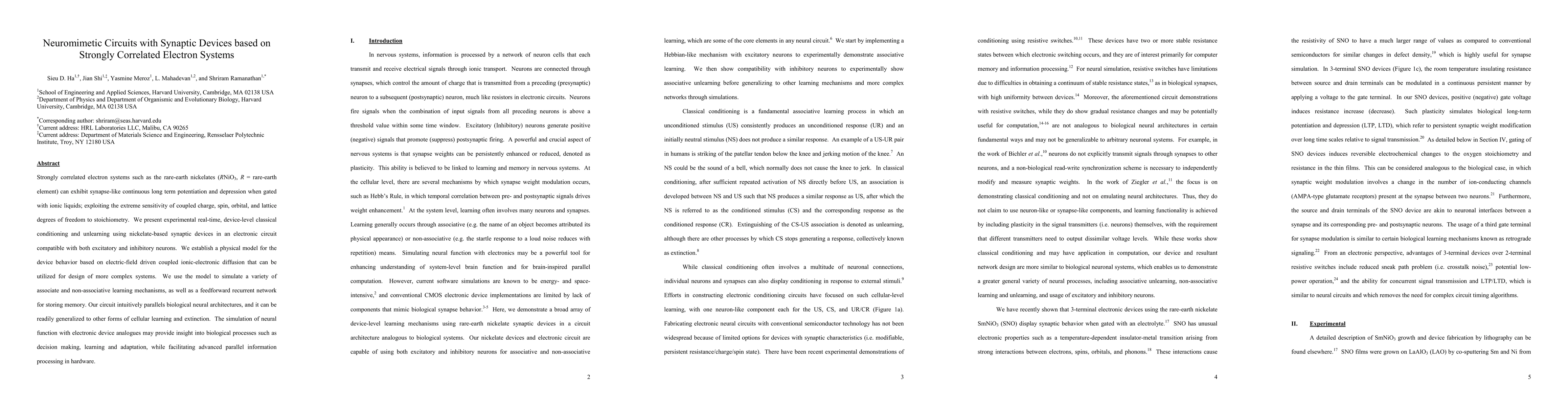 Strongly correlated electron systems such as the rare-earth nickelates (RNiO3, R = rare-earth element) can exhibit synapse-like continuous long term potentiation and depression when gated with ionic liquids; exploiting the extreme sensitivity of coupled charge, spin, orbital, and lattice degrees of freedom to stoichiometry. We present experimental real-time, device-level classical conditioning and unlearning using nickelate-based synaptic devices in an electronic circuit compatible with both excitatory and inhibitory neurons. We establish a physical model for the device behavior based on electric-field driven coupled ionic-electronic diffusion that can be utilized for design of more complex systems. We use the model to simulate a variety of associate and non-associative learning mechanisms, as well as a feedforward recurrent network for storing memory. Our circuit intuitively parallels biological neural architectures, and it can be readily generalized to other forms of cellular learning and extinction. The simulation of neural function with electronic device analogues may provide insight into biological processes such as decision making, learning and adaptation, while facilitating advanced parallel information processing in hardware.