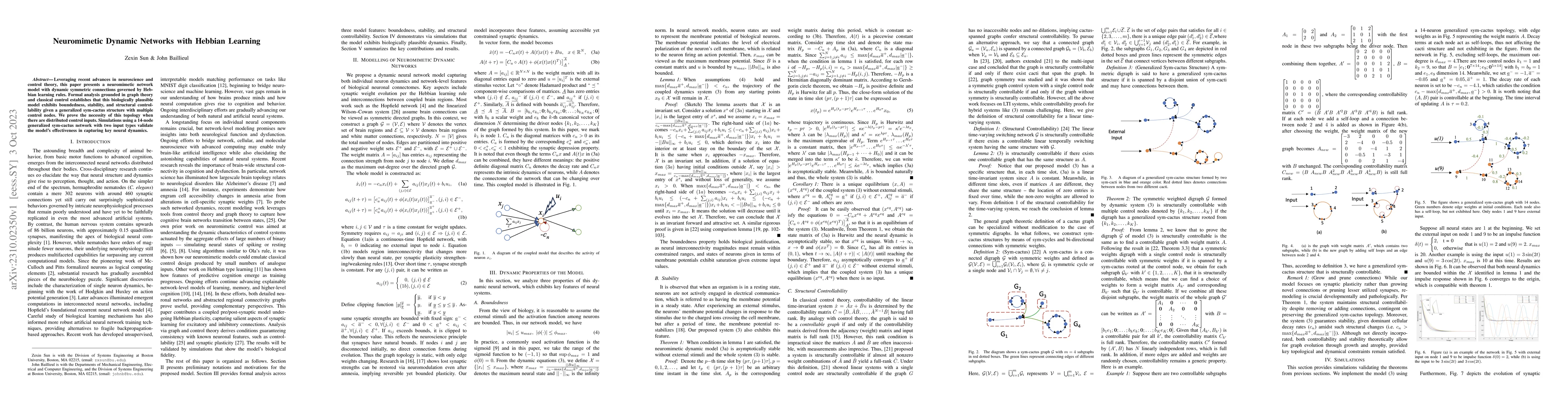 This paper introduces a neuromimetic network model with dynamic connections governed by Hebbian learning, demonstrating its boundedness, stability, and controllability through formal analysis and simulations on a 14-node network. The study proves the necessity of a generalized sym-cactus topology for effective distributed control inputs.