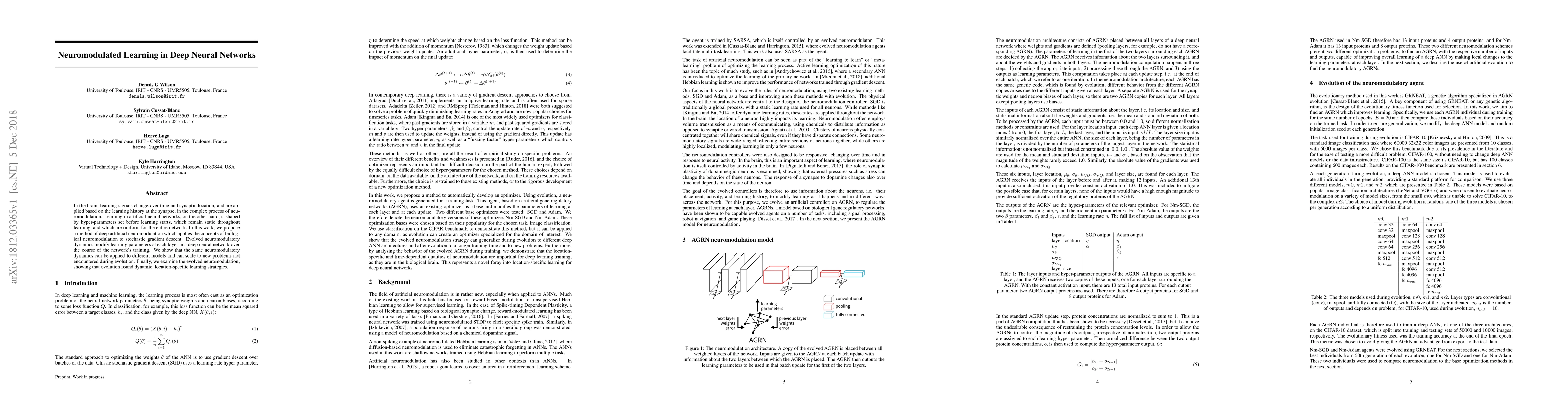 In the brain, learning signals change over time and synaptic location, and are applied based on the learning history at the synapse, in the complex process of neuromodulation. Learning in artificial neural networks, on the other hand, is shaped by hyper-parameters set before learning starts, which remain static throughout learning, and which are uniform for the entire network. In this work, we propose a method of deep artificial neuromodulation which applies the concepts of biological neuromodulation to stochastic gradient descent. Evolved neuromodulatory dynamics modify learning parameters at each layer in a deep neural network over the course of the network's training. We show that the same neuromodulatory dynamics can be applied to different models and can scale to new problems not encountered during evolution. Finally, we examine the evolved neuromodulation, showing that evolution found dynamic, location-specific learning strategies.