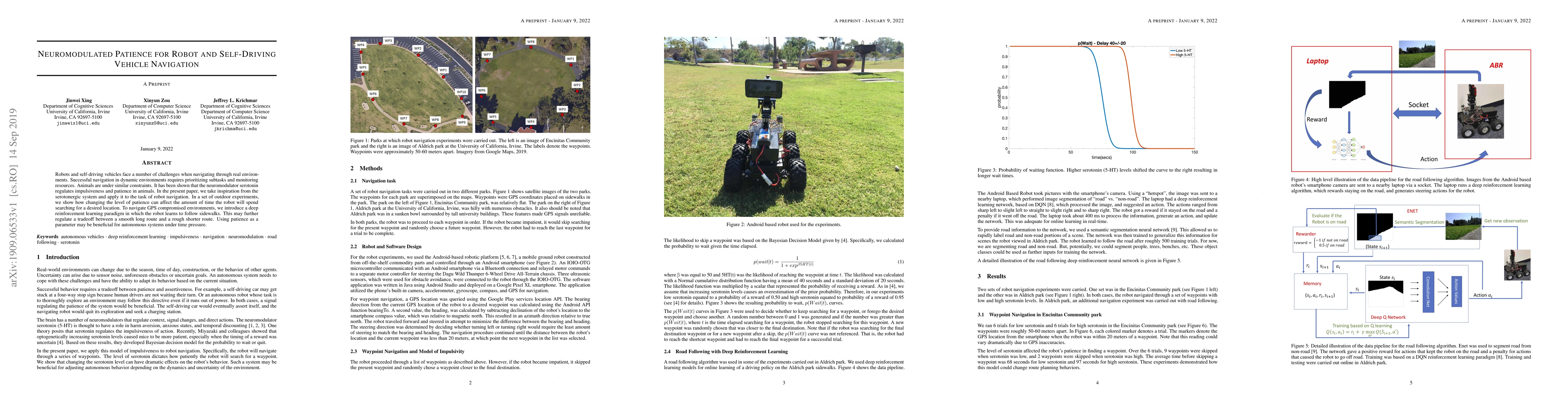 Robots and self-driving vehicles face a number of challenges when navigating through real environments. Successful navigation in dynamic environments requires prioritizing subtasks and monitoring resources. Animals are under similar constraints. It has been shown that the neuromodulator serotonin regulates impulsiveness and patience in animals. In the present paper, we take inspiration from the serotonergic system and apply it to the task of robot navigation. In a set of outdoor experiments, we show how changing the level of patience can affect the amount of time the robot will spend searching for a desired location. To navigate GPS compromised environments, we introduce a deep reinforcement learning paradigm in which the robot learns to follow sidewalks. This may further regulate a tradeoff between a smooth long route and a rough shorter route. Using patience as a parameter may be beneficial for autonomous systems under time pressure.