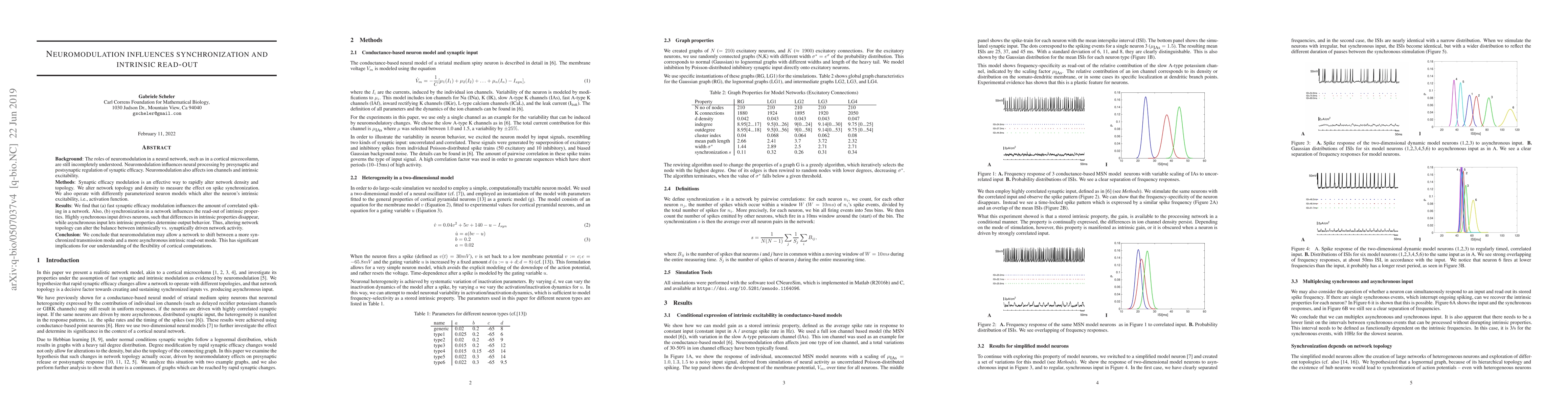 Background: The roles of neuromodulation in a neural network, such as in a cortical microcolumn, are still incompletely understood. Neuromodulation influences neural processing by presynaptic and postsynaptic regulation of synaptic efficacy. Neuromodulation also affects ion channels and intrinsic excitability. Methods: Synaptic efficacy modulation is an effective way to rapidly alter network density and topology. We alter network topology and density to measure the effect on spike synchronization. We also operate with differently parameterized neuron models which alter the neurons intrinsic excitability, i.e., activation function. Results: We find that (a) fast synaptic efficacy modulation influences the amount of correlated spiking in a network. Also, (b) synchronization in a network influences the read-out of intrinsic properties. Highly synchronous input drives neurons, such that differences in intrinsic properties disappear, while asynchronous input lets intrinsic properties determine output behavior. Thus, altering network topology can alter the balance between intrinsically vs. synaptically driven network activity. Conclusion: We conclude that neuromodulation may allow a network to shift between a more synchronized transmission mode and a more asynchronous intrinsic read-out mode. This has significant implications for our understanding of the flexibility of cortical computations.