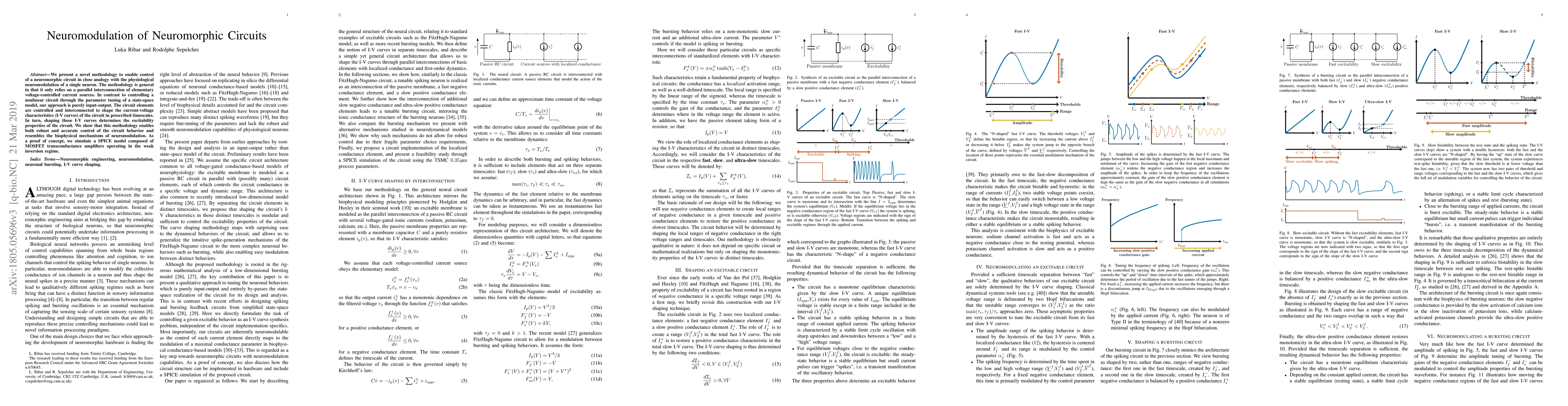 We present a novel methodology to enable control of a neuromorphic circuit in close analogy with the physiological neuromodulation of a single neuron. The methodology is general in that it only relies on a parallel interconnection of elementary voltage-controlled current sources. In contrast to controlling a nonlinear circuit through the parameter tuning of a state-space model, our approach is purely input-output. The circuit elements are controlled and interconnected to shape the current-voltage characteristics (I-V curves) of the circuit in prescribed timescales. In turn, shaping those I-V curves determines the excitability properties of the circuit. We show that this methodology enables both robust and accurate control of the circuit behavior and resembles the biophysical mechanisms of neuromodulation. As a proof of concept, we simulate a SPICE model composed of MOSFET transconductance amplifiers operating in the weak inversion regime.