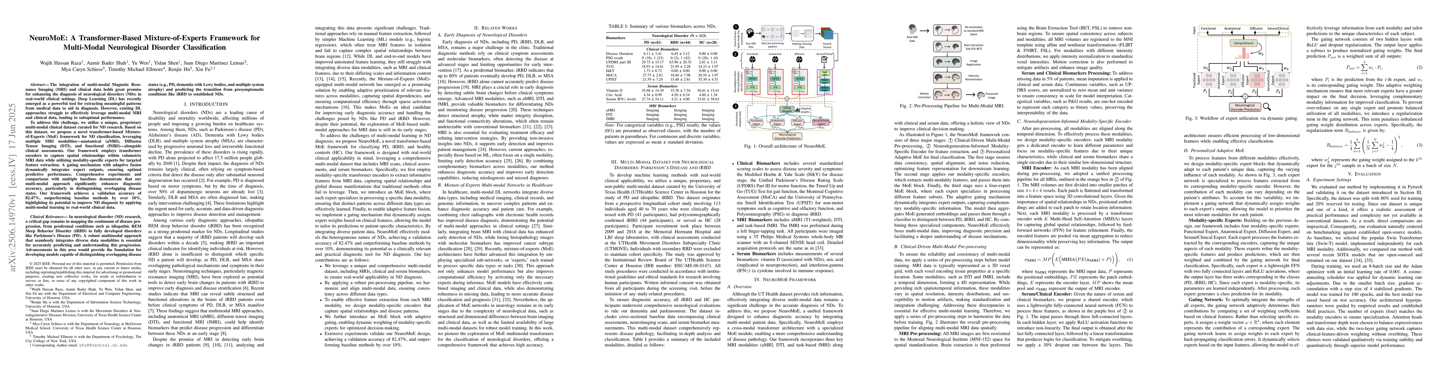 The integration of multi-modal Magnetic Resonance Imaging (MRI) and clinical data holds great promise for enhancing the diagnosis of neurological disorders (NDs) in real-world clinical settings. Deep Learning (DL) has recently emerged as a powerful tool for extracting meaningful patterns from medical data to aid in diagnosis. However, existing DL approaches struggle to effectively leverage multi-modal MRI and clinical data, leading to suboptimal performance. To address this challenge, we utilize a unique, proprietary multi-modal clinical dataset curated for ND research. Based on this dataset, we propose a novel transformer-based Mixture-of-Experts (MoE) framework for ND classification, leveraging multiple MRI modalities-anatomical (aMRI), Diffusion Tensor Imaging (DTI), and functional (fMRI)-alongside clinical assessments. Our framework employs transformer encoders to capture spatial relationships within volumetric MRI data while utilizing modality-specific experts for targeted feature extraction. A gating mechanism with adaptive fusion dynamically integrates expert outputs, ensuring optimal predictive performance. Comprehensive experiments and comparisons with multiple baselines demonstrate that our multi-modal approach significantly enhances diagnostic accuracy, particularly in distinguishing overlapping disease states. Our framework achieves a validation accuracy of 82.47\%, outperforming baseline methods by over 10\%, highlighting its potential to improve ND diagnosis by applying multi-modal learning to real-world clinical data.