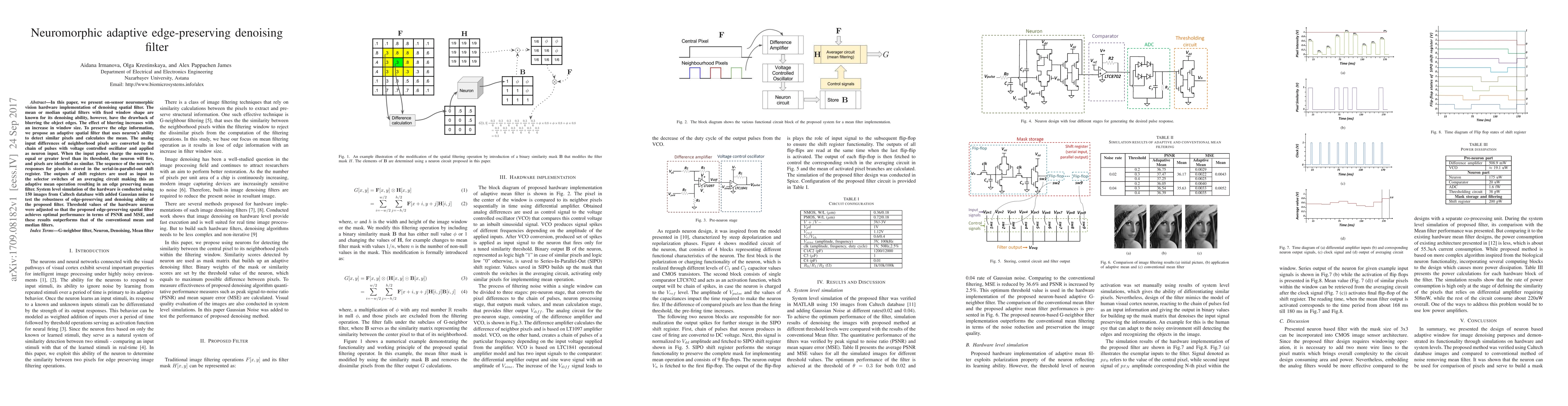 In this paper, we present on-sensor neuromorphic vision hardware implementation of denoising spatial filter. The mean or median spatial filters with fixed window shape are known for its denoising ability, however, have the drawback of blurring the object edges. The effect of blurring increases with an increase in window size. To preserve the edge information, we propose an adaptive spatial filter that uses neuron's ability to detect similar pixels and calculates the mean. The analog input differences of neighborhood pixels are converted to the chain of pulses with voltage controlled oscillator and applied as neuron input. When the input pulses charge the neuron to equal or greater level than its threshold, the neuron will fire, and pixels are identified as similar. The sequence of the neuron's responses for pixels is stored in the serial-in-parallel-out shift register. The outputs of shift registers are used as input to the selector switches of an averaging circuit making this an adaptive mean operation resulting in an edge preserving mean filter. System level simulation of the hardware is conducted using 150 images from Caltech database with added Gaussian noise to test the robustness of edge-preserving and denoising ability of the proposed filter. Threshold values of the hardware neuron were adjusted so that the proposed edge-preserving spatial filter achieves optimal performance in terms of PSNR and MSE, and these results outperforms that of the conventional mean and median filters.