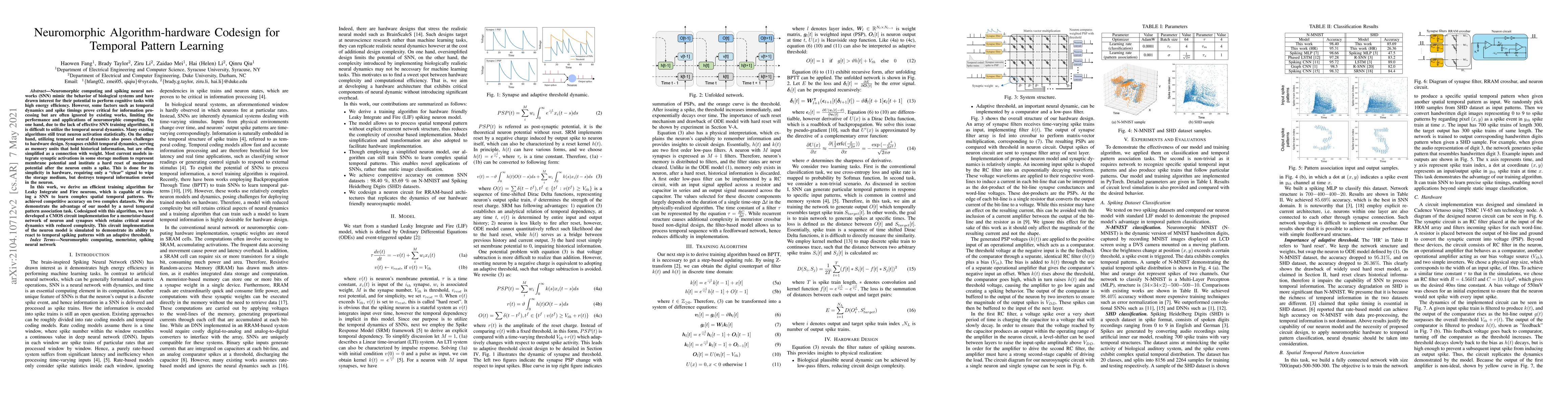 Neuromorphic computing and spiking neural networks (SNN) mimic the behavior of biological systems and have drawn interest for their potential to perform cognitive tasks with high energy efficiency. However, some factors such as temporal dynamics and spike timings prove critical for information processing but are often ignored by existing works, limiting the performance and applications of neuromorphic computing. On one hand, due to the lack of effective SNN training algorithms, it is difficult to utilize the temporal neural dynamics. Many existing algorithms still treat neuron activation statistically. On the other hand, utilizing temporal neural dynamics also poses challenges to hardware design. Synapses exhibit temporal dynamics, serving as memory units that hold historical information, but are often simplified as a connection with weight. Most current models integrate synaptic activations in some storage medium to represent membrane potential and institute a hard reset of membrane potential after the neuron emits a spike. This is done for its simplicity in hardware, requiring only a "clear" signal to wipe the storage medium, but destroys temporal information stored in the neuron. In this work, we derive an efficient training algorithm for Leaky Integrate and Fire neurons, which is capable of training a SNN to learn complex spatial temporal patterns. We achieved competitive accuracy on two complex datasets. We also demonstrate the advantage of our model by a novel temporal pattern association task. Codesigned with this algorithm, we have developed a CMOS circuit implementation for a memristor-based network of neuron and synapses which retains critical neural dynamics with reduced complexity. This circuit implementation of the neuron model is simulated to demonstrate its ability to react to temporal spiking patterns with an adaptive threshold.