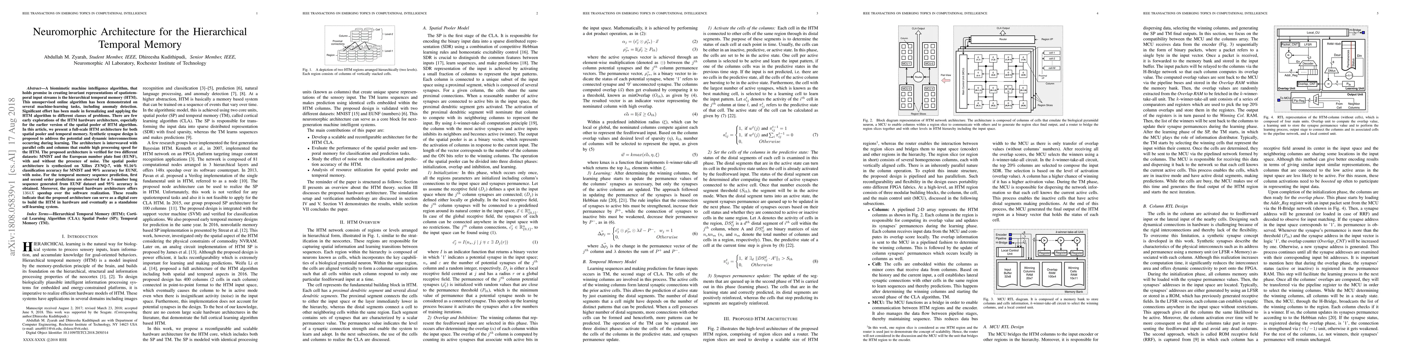 This paper presents a neuromorphic architecture for the hierarchical temporal memory (HTM) algorithm, focusing on both the spatial pooler and temporal memory. The proposed synthetic synapse design and parallel processing cells enable high-speed processing and achieve 91.16% accuracy on MNIST and 90% on EUNF with noise. The architecture offers a 1364X speedup over software, demonstrating potential as a digital core for HTM-based self-learning systems.