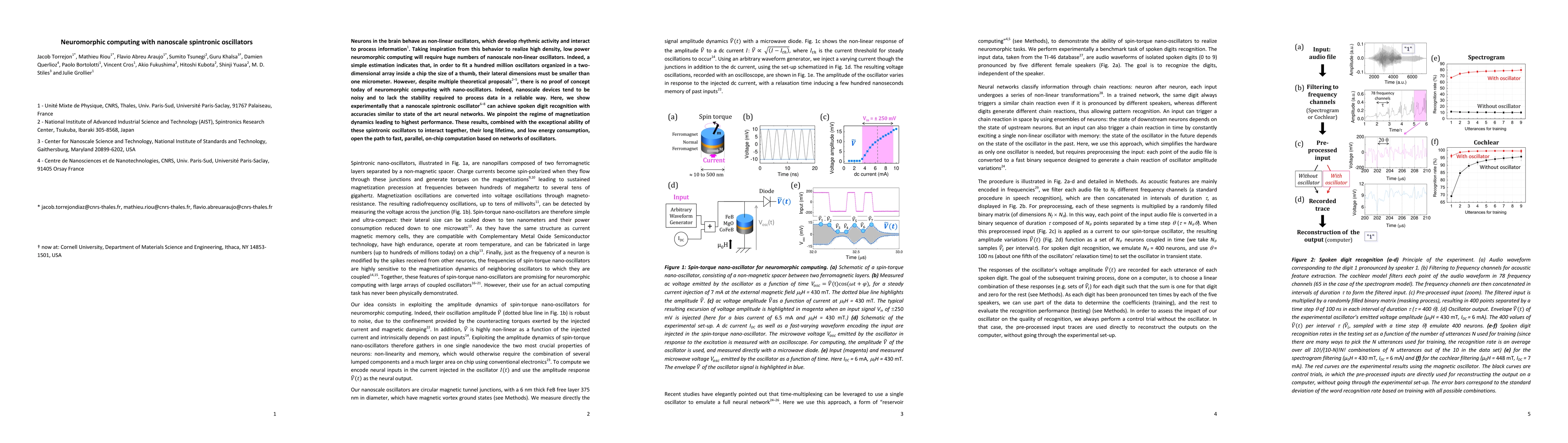 This paper demonstrates the potential of nanoscale spintronic oscillators for neuromorphic computing, achieving spoken digit recognition accuracy comparable to neural networks. The study highlights the optimal magnetization dynamics for high performance and reveals the promise of these devices for low-power, parallel on-chip computation.