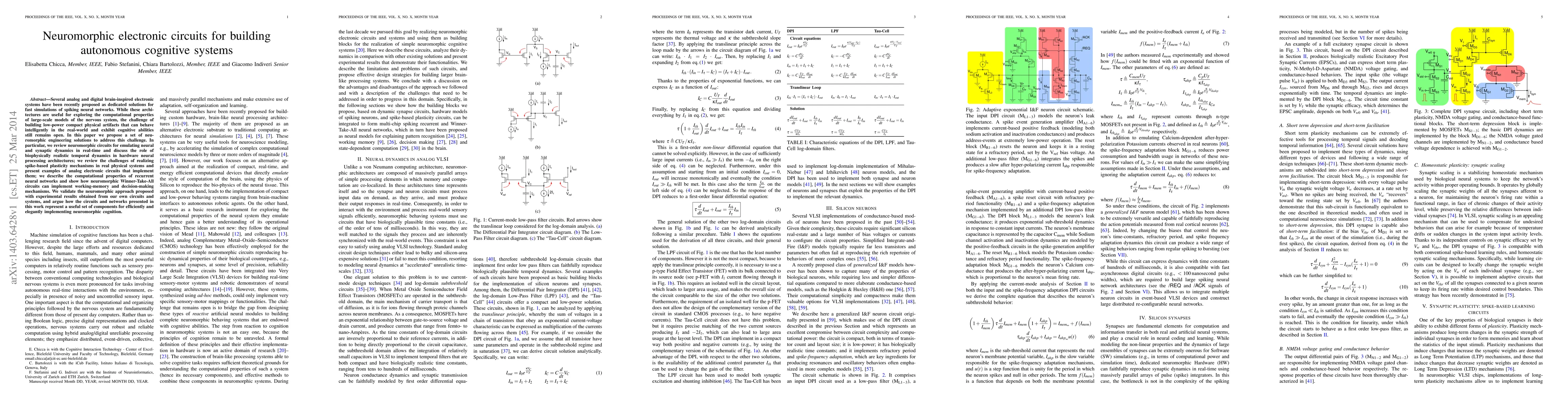This paper proposes neuromorphic electronic circuits to emulate neural and synaptic dynamics for real-time cognitive processing, addressing the challenge of creating low-power, compact systems with intelligent behavior. It reviews circuit implementations of spike-based plasticity and demonstrates working-memory and decision-making through neuromorphic Winner-Take-All circuits, validated by experimental results.