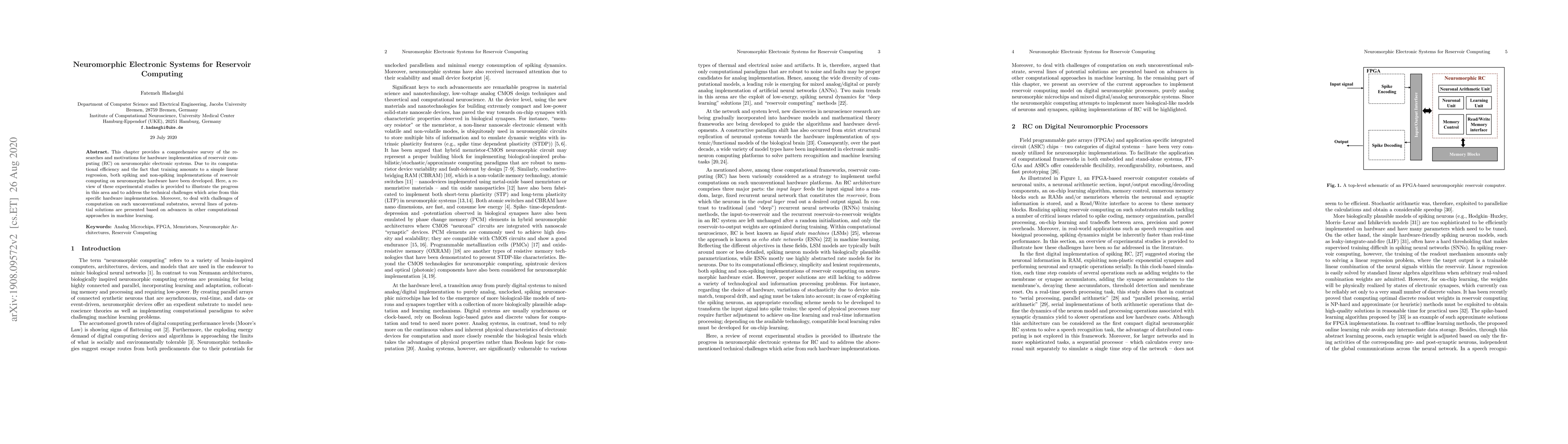 This paper surveys hardware implementations of reservoir computing on neuromorphic electronic systems, highlighting their computational efficiency and the simplicity of training via linear regression. It reviews experimental studies and addresses technical challenges, proposing potential solutions based on advances in machine learning.