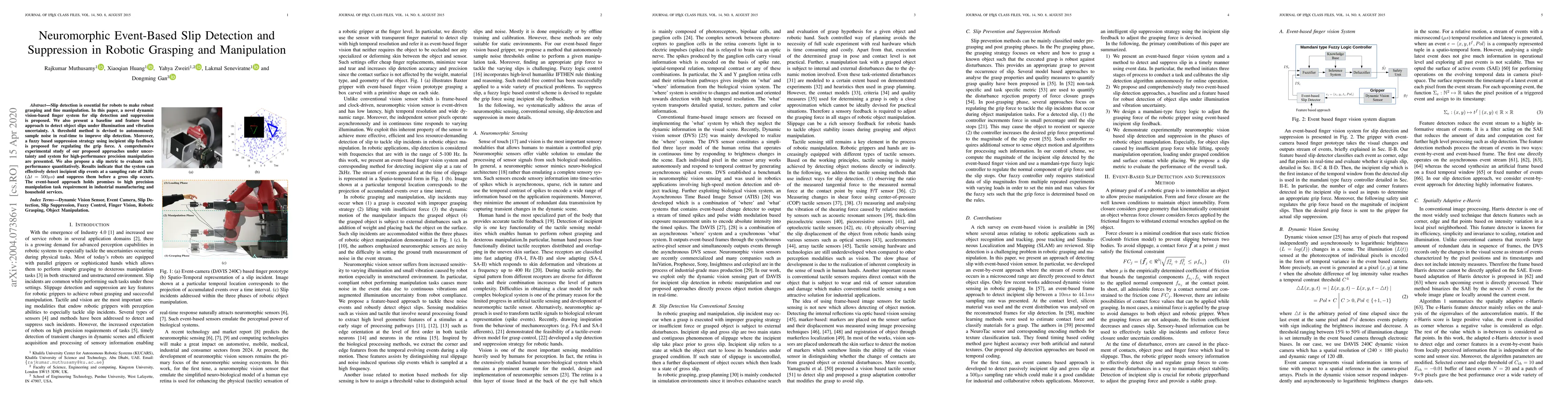 Slip detection is essential for robots to make robust grasping and fine manipulation. In this paper, a novel dynamic vision-based finger system for slip detection and suppression is proposed. We also present a baseline and feature based approach to detect object slips under illumination and vibration uncertainty. A threshold method is devised to autonomously sample noise in real-time to improve slip detection. Moreover, a fuzzy based suppression strategy using incipient slip feedback is proposed for regulating the grip force. A comprehensive experimental study of our proposed approaches under uncertainty and system for high-performance precision manipulation are presented. We also propose a slip metric to evaluate such performance quantitatively. Results indicate that the system can effectively detect incipient slip events at a sampling rate of 2kHz ($\Delta t = 500\mu s$) and suppress them before a gross slip occurs. The event-based approach holds promises to high precision manipulation task requirement in industrial manufacturing and household services.