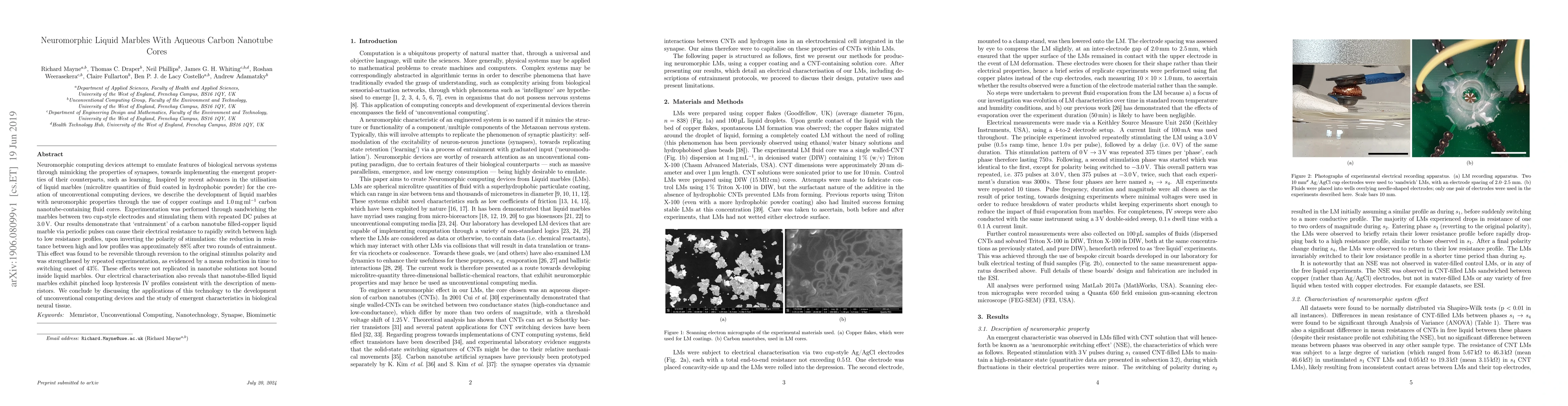Neuromorphic computing devices attempt to emulate features of biological nervous systems through mimicking the properties of synapses, towards implementing the emergent properties of their counterparts, such as learning. Inspired by recent advances in the utilisation of liquid marbles (microlitre quantities of fluid coated in hydrophobic powder) for the creation of unconventional computing devices, we describe the development of liquid marbles with neuromorphic properties through the use of copper coatings and 1.0 mg/ml carbon nanotube-containing fluid cores. Experimentation was performed through sandwiching the marbles between two cup-style electrodes and stimulating them with repeated DC pulses at 3.0 V. Our results demonstrate that `entrainment' of a carbon nanotube filled-copper liquid marble via periodic pulses can cause their electrical resistance to rapidly switch between high to low resistance profiles, upon inverting the polarity of stimulation: the reduction in resistance between high and low profiles was approximately 88\% after two rounds of entrainment. This effect was found to be reversible through reversion to the original stimulus polarity and was strengthened by repeated experimentation, as evidenced by a mean reduction in time to switching onset of 43\%. These effects were not replicated in nanotube solutions not bound inside liquid marbles. Our electrical characterisation also reveals that nanotube-filled liquid marbles exhibit pinched loop hysteresis IV profiles consistent with the description of memristors. We conclude by discussing the applications of this technology to the development of unconventional computing devices and the study of emergent characteristics in biological neural tissue.