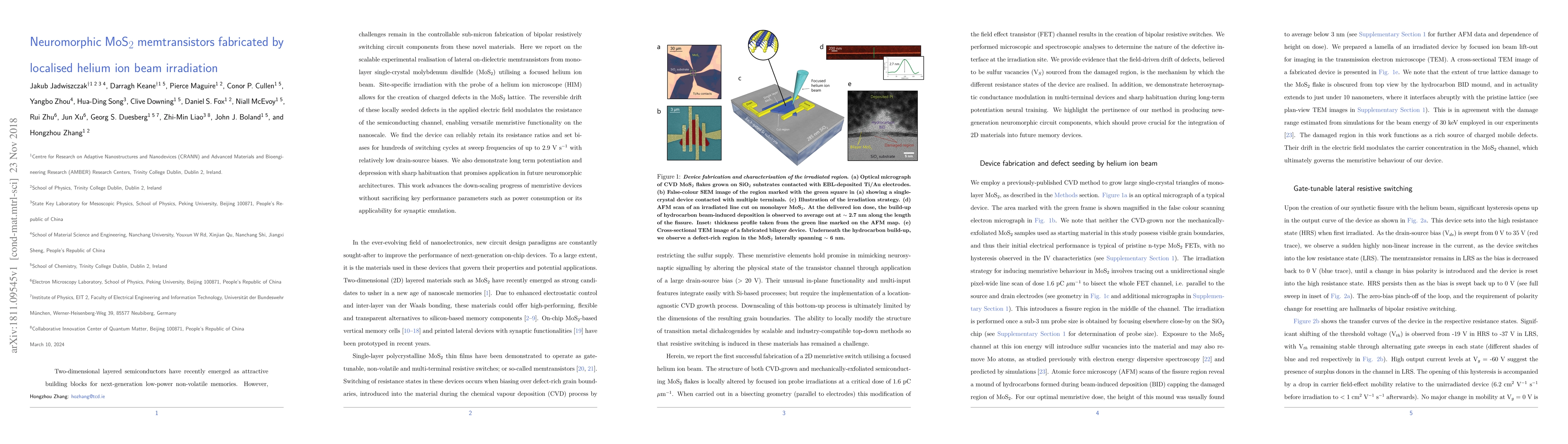 Researchers have successfully fabricated memtransistors from monolayer MoS2 using helium ion beam irradiation, achieving reversible resistance modulation for neuromorphic applications.