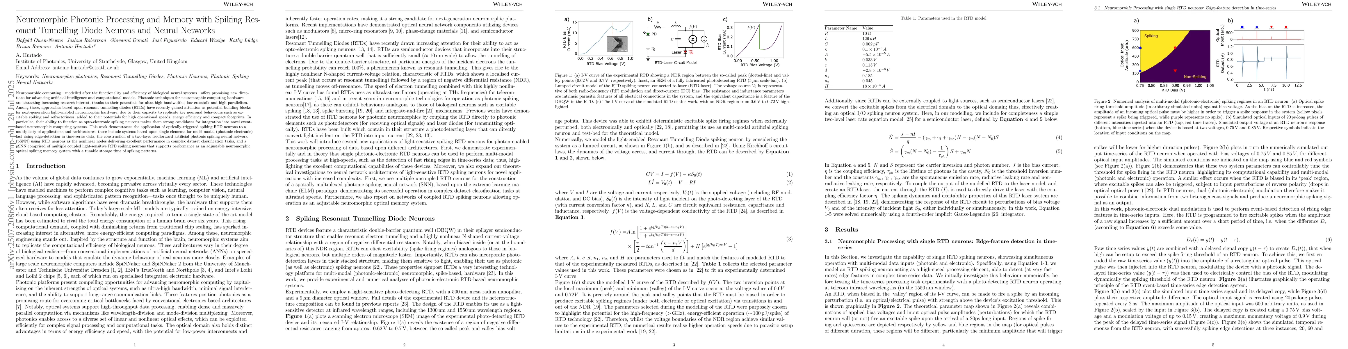 Neuromorphic computing-modelled after the functionality and efficiency of biological neural systems-offers promising new directions for advancing artificial intelligence and computational models. Photonic techniques for neuromorphic computing hardware are attracting increasing research interest, thanks to their potentials for ultra high bandwidths, low-crosstalk and high parallelism. Among these, approaches based upon resonant tunnelling diodes (RTDs) have recently gained attention as potential building blocks for next-generation light-enabled neuromorphic hardware, due to their capacity to replicate key neuronal behaviours such as excitable spiking and refractoriness, added to their potentials for high operational speeds, energy efficiency and compact footprints. In particular, their ability to function as opto-electronic spiking neurons makes them strong candidates for integration into novel event based neuromorphic computing systems. This work demonstrates the application of optically-triggered spiking RTD neurons to a multiplicity of applications and architectures, these include systems based upon single elements for multi-modal (photonic-electronic) fast rising edge-detection in time-series data, the construction of a two-layer feedforward artificial photonic spiking neural network (pSNN) using RTD neurons as the nonlinear nodes delivering excellent performance in complex dataset classification tasks, and a pSNN comprised of multiple coupled light-sensitive RTD spiking neurons that supports performance as an adjustable neuromorphic optical spiking memory system with a tunable storage time of spiking patterns.