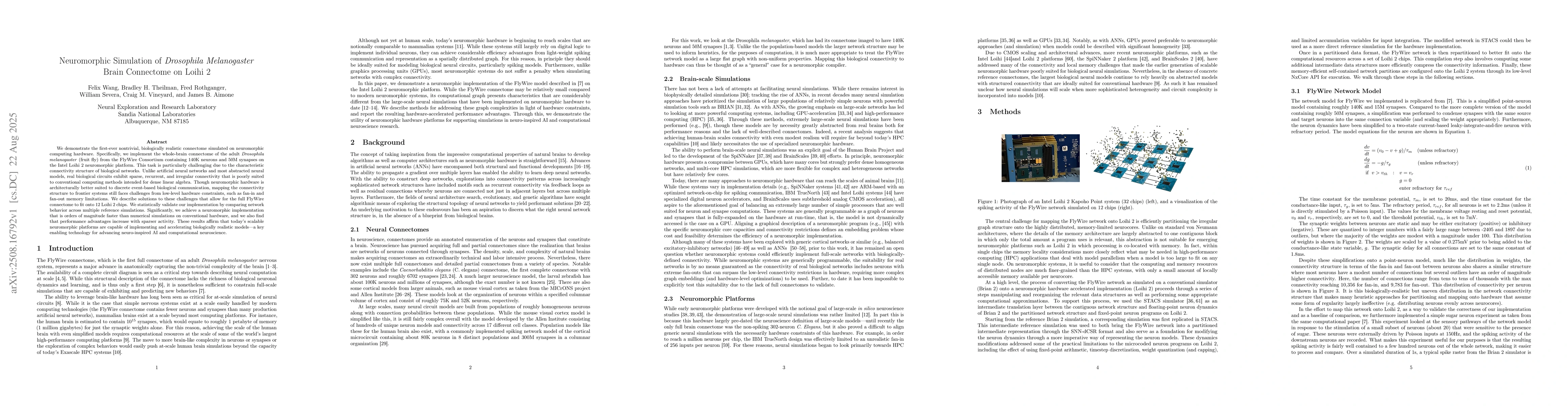 We demonstrate the first-ever nontrivial, biologically realistic connectome simulated on neuromorphic computing hardware. Specifically, we implement the whole-brain connectome of the adult Drosophila melanogaster (fruit fly) from the FlyWire Consortium containing 140K neurons and 50M synapses on the Intel Loihi 2 neuromorphic platform. This task is particularly challenging due to the characteristic connectivity structure of biological networks. Unlike artificial neural networks and most abstracted neural models, real biological circuits exhibit sparse, recurrent, and irregular connectivity that is poorly suited to conventional computing methods intended for dense linear algebra. Though neuromorphic hardware is architecturally better suited to discrete event-based biological communication, mapping the connectivity structure to frontier systems still faces challenges from low-level hardware constraints, such as fan-in and fan-out memory limitations. We describe solutions to these challenges that allow for the full FlyWire connectome to fit onto 12 Loihi 2 chips. We statistically validate our implementation by comparing network behavior across multiple reference simulations. Significantly, we achieve a neuromorphic implementation that is orders of magnitude faster than numerical simulations on conventional hardware, and we also find that performance advantages increase with sparser activity. These results affirm that today's scalable neuromorphic platforms are capable of implementing and accelerating biologically realistic models -- a key enabling technology for advancing neuro-inspired AI and computational neuroscience.