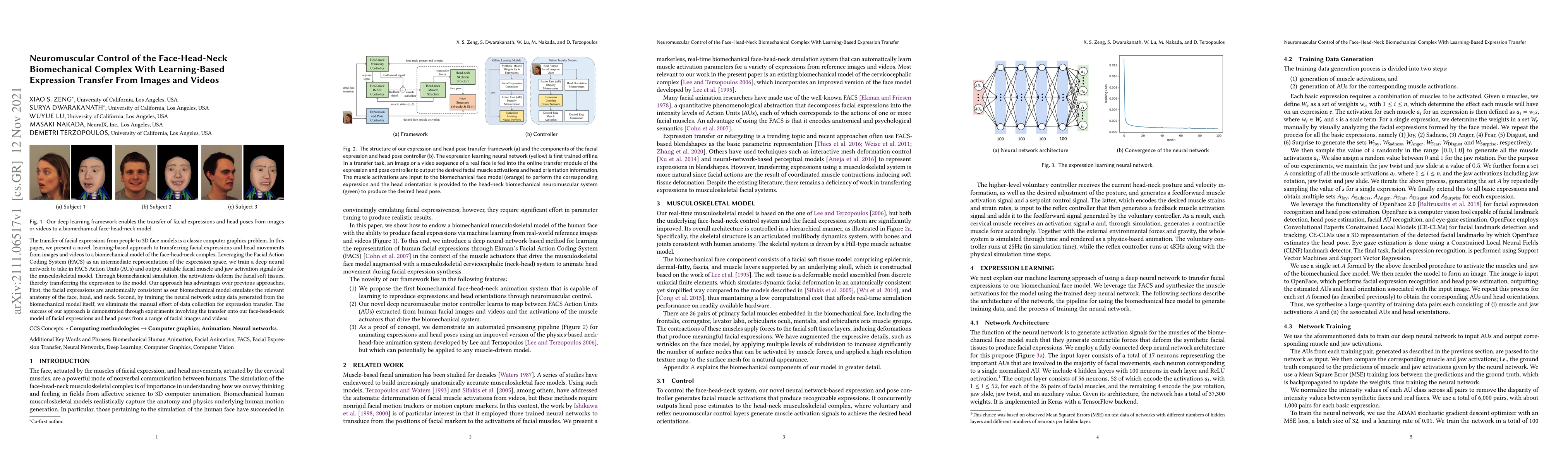 This paper introduces a learning-based method for transferring facial expressions and head movements to a biomechanical model of the face-head-neck complex using deep neural networks and the Facial Action Coding System, achieving anatomically consistent results without manual data collection. Experiments demonstrate successful expression and head pose transfer from images and videos.