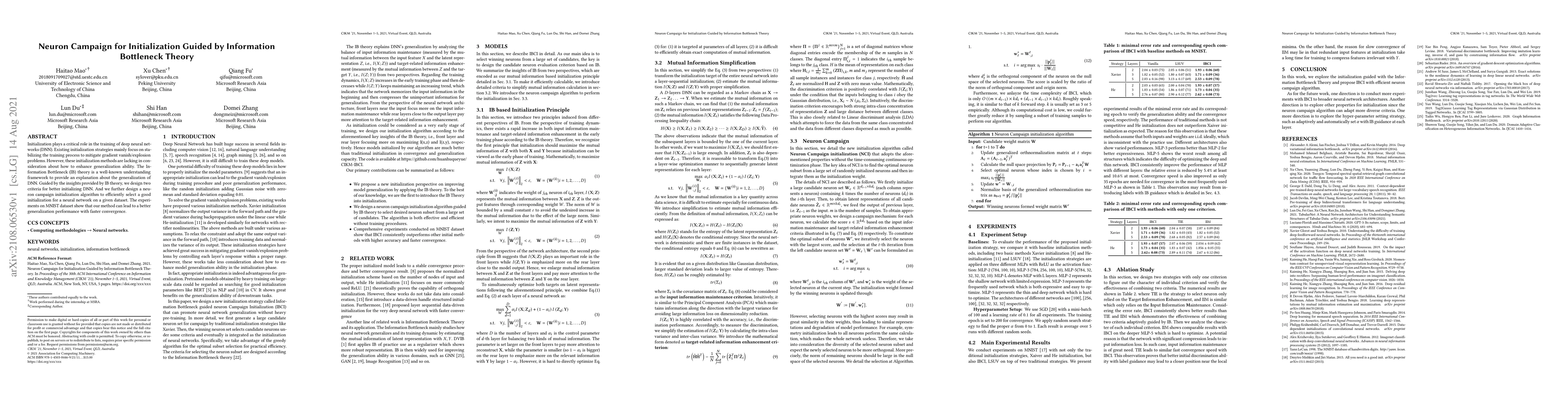 Initialization plays a critical role in the training of deep neural networks (DNN). Existing initialization strategies mainly focus on stabilizing the training process to mitigate gradient vanish/explosion problems. However, these initialization methods are lacking in consideration about how to enhance generalization ability. The Information Bottleneck (IB) theory is a well-known understanding framework to provide an explanation about the generalization of DNN. Guided by the insights provided by IB theory, we design two criteria for better initializing DNN. And we further design a neuron campaign initialization algorithm to efficiently select a good initialization for a neural network on a given dataset. The experiments on MNIST dataset show that our method can lead to a better generalization performance with faster convergence.