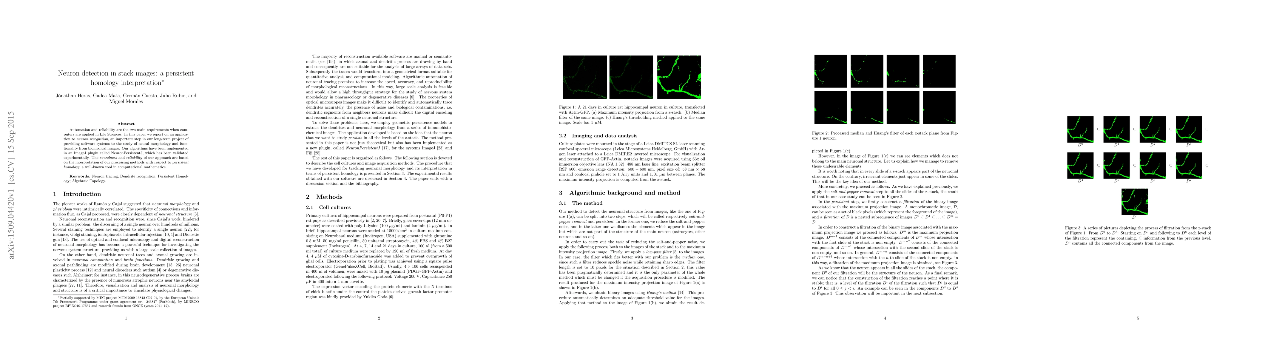 Automation and reliability are the two main requirements when computers are applied in Life Sciences. In this paper we report on an application to neuron recognition, an important step in our long-term project of providing software systems to the study of neural morphology and functionality from biomedical images. Our algorithms have been implemented in an ImageJ plugin called NeuronPersistentJ, which has been validated experimentally. The soundness and reliability of our approach are based on the interpretation of our processing methods with respect to persistent homology, a well-known tool in computational mathematics.