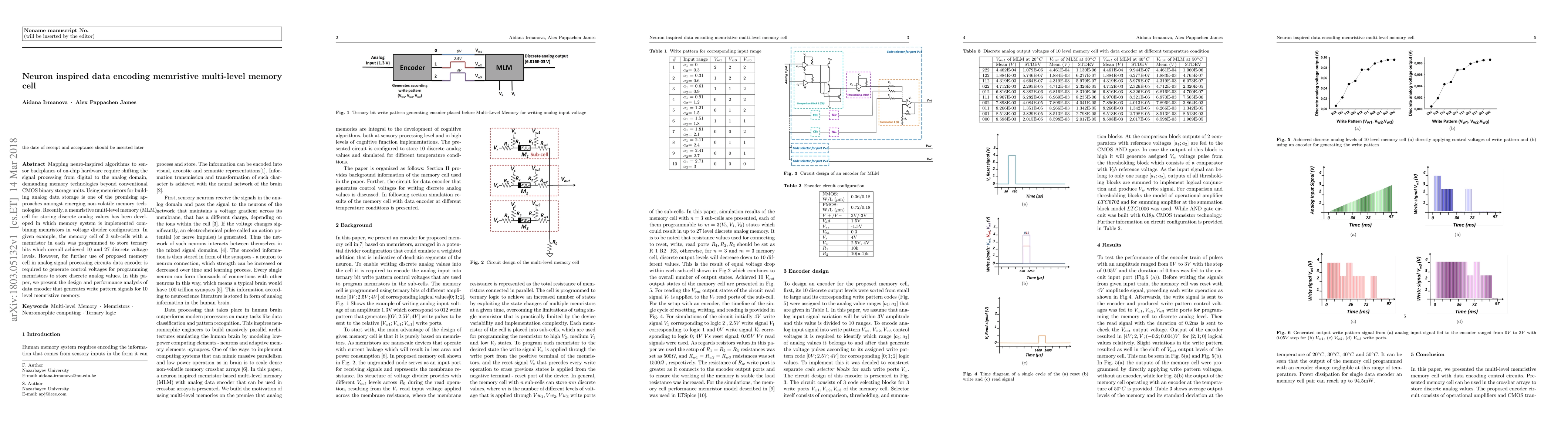 This paper presents a data encoder designed for a memristive multi-level memory cell that stores discrete analog values using ternary bits. The encoder generates control voltages for programming memristors, enabling the storage of 10 and 27 discrete voltage levels, facilitating the transition from digital to analog signal processing in neuro-inspired algorithms.