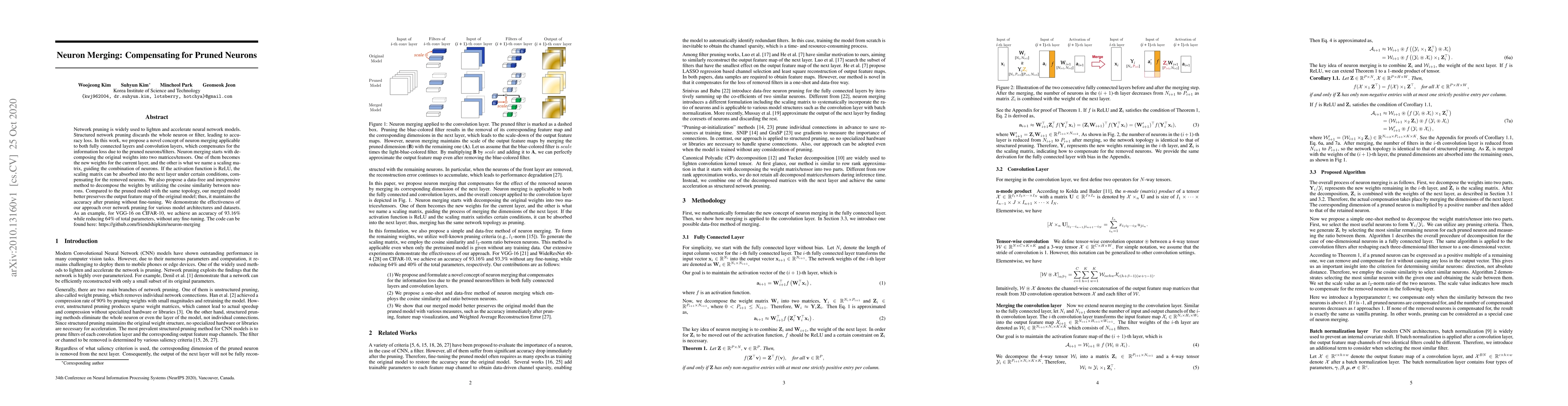 Researchers propose a method to compensate for pruned neurons in neural networks by merging them, preserving output feature maps and accuracy without fine-tuning.