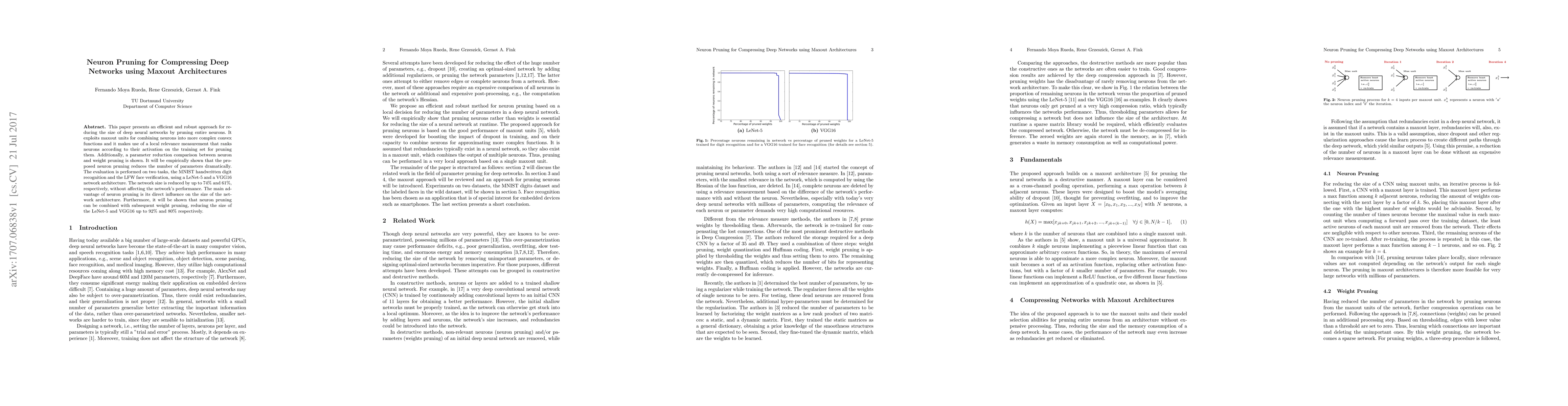 This paper presents an efficient and robust approach for reducing the size of deep neural networks by pruning entire neurons. It exploits maxout units for combining neurons into more complex convex functions and it makes use of a local relevance measurement that ranks neurons according to their activation on the training set for pruning them. Additionally, a parameter reduction comparison between neuron and weight pruning is shown. It will be empirically shown that the proposed neuron pruning reduces the number of parameters dramatically. The evaluation is performed on two tasks, the MNIST handwritten digit recognition and the LFW face verification, using a LeNet-5 and a VGG16 network architecture. The network size is reduced by up to $74\%$ and $61\%$, respectively, without affecting the network's performance. The main advantage of neuron pruning is its direct influence on the size of the network architecture. Furthermore, it will be shown that neuron pruning can be combined with subsequent weight pruning, reducing the size of the LeNet-5 and VGG16 up to $92\%$ and $80\%$ respectively.