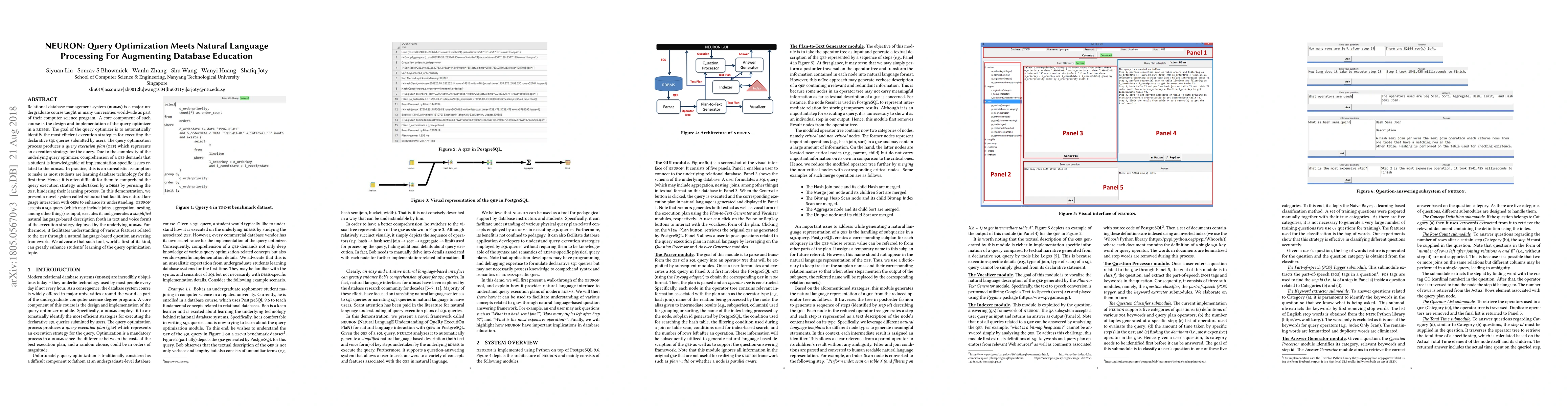 NEURON is a novel system designed to enhance database education by enabling natural language interaction with query execution plans (QEPs). It generates simplified natural language descriptions of the execution strategies used by RDBMSs, aiming to improve students' comprehension of complex query optimization processes.