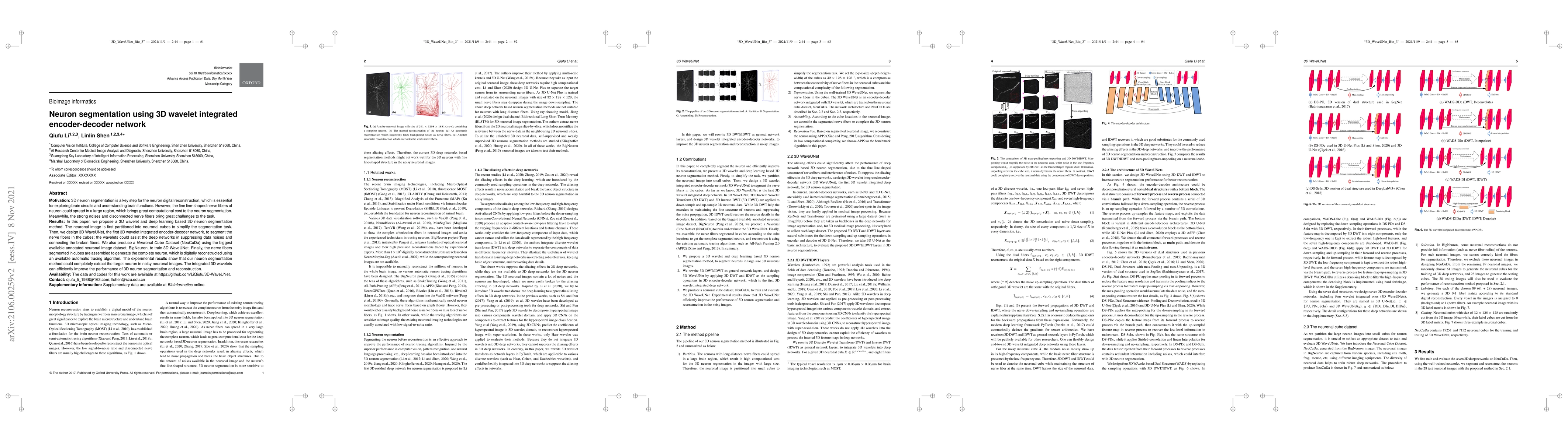 This paper proposes a 3D wavelet integrated encoder-decoder network, 3D WaveUNet, for efficient 3D neuron segmentation in noisy images. The method partitions neuronal images into cubes, applies the network to segment nerve fibers, and reconstructs complete neurons, demonstrating improved performance over traditional methods.