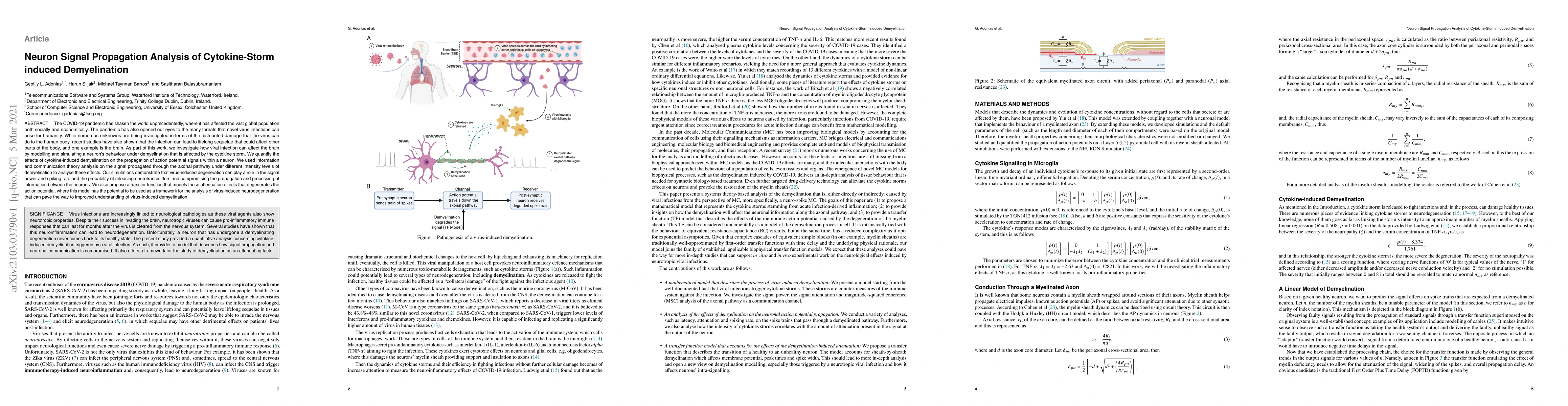 The COVID-19 pandemic has shaken the world unprecedentedly, where it has affected the vast global population both socially and economically. The pandemic has also opened our eyes to the many threats that novel virus infections can pose for humanity. While numerous unknowns are being investigated in terms of the distributed damage that the virus can do to the human body, recent studies have also shown that the infection can lead to lifelong sequelae that could affect other parts of the body, and one example is the brain. As part of this work, we investigate how viral infection can affect the brain by modelling and simulating a neuron's behaviour under demyelination that is affected by the cytokine storm. We quantify the effects of cytokine-induced demyelination on the propagation of action potential signals within a neuron. We used information and communication theory analysis on the signal propagated through the axonal pathway under different intensity levels of demyelination to analyse these effects. Our simulations demonstrate that virus-induced degeneration can play a role in the signal power and spiking rate and the probability of releasing neurotransmitters and compromising the propagation and processing of information between the neurons. We also propose a transfer function that models these attenuation effects that degenerates the action potential, where this model has the potential to be used as a framework for the analysis of virus-induced neurodegeneration that can pave the way to improved understanding of virus-induced demyelination.