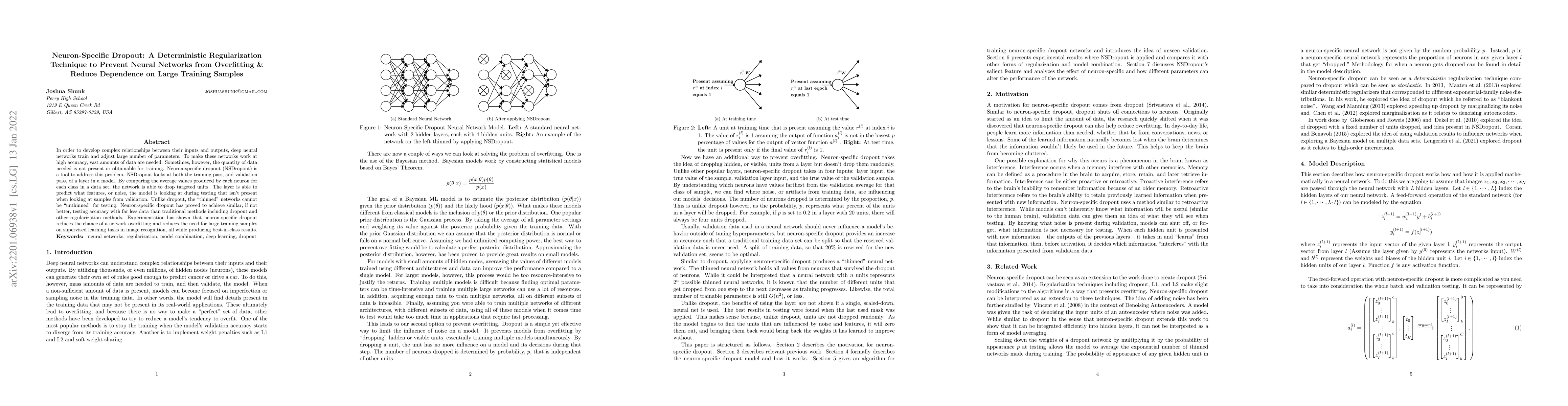 In order to develop complex relationships between their inputs and outputs, deep neural networks train and adjust large number of parameters. To make these networks work at high accuracy, vast amounts of data are needed. Sometimes, however, the quantity of data needed is not present or obtainable for training. Neuron-specific dropout (NSDropout) is a tool to address this problem. NSDropout looks at both the training pass, and validation pass, of a layer in a model. By comparing the average values produced by each neuron for each class in a data set, the network is able to drop targeted units. The layer is able to predict what features, or noise, the model is looking at during testing that isn't present when looking at samples from validation. Unlike dropout, the "thinned" networks cannot be "unthinned" for testing. Neuron-specific dropout has proved to achieve similar, if not better, testing accuracy with far less data than traditional methods including dropout and other regularization methods. Experimentation has shown that neuron-specific dropout reduces the chance of a network overfitting and reduces the need for large training samples on supervised learning tasks in image recognition, all while producing best-in-class results.