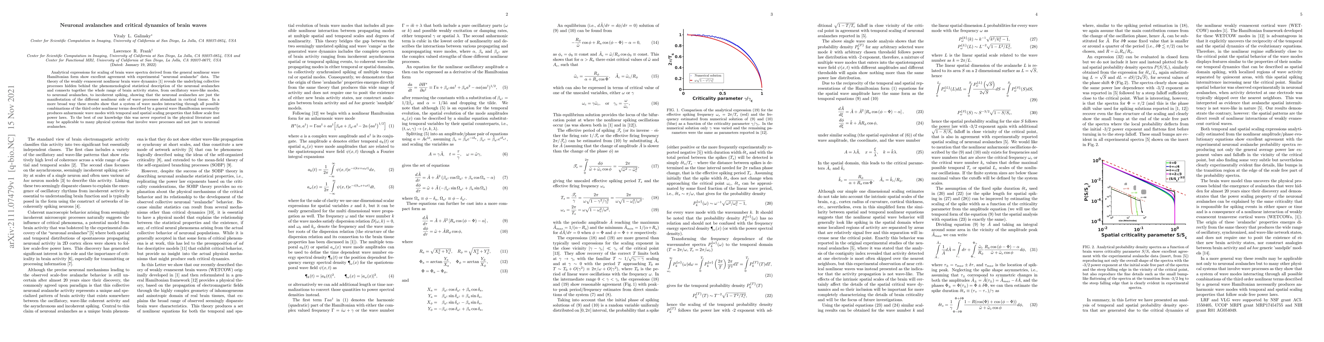 Analytical expressions for scaling of brain wave spectra derived from the general nonlinear wave Hamiltonian form show excellent agreement with experimental "neuronal avalanche" data. The theory of the weakly evanescent nonlinear brain wave dynamics reveals the underlying collective processes hidden behind the phenomenological statistical description of the neuronal avalanches and connects together the whole range of brain activity states, from oscillatory wave-like modes, to neuronal avalanches, to incoherent spiking, showing that the neuronal avalanches are just the manifestation of the different nonlinear side of wave processes abundant in cortical tissue. In a more broad way these results show that a system of wave modes interacting through all possible combinations of the third order nonlinear terms described by a general wave Hamiltonian necessarily produces anharmonic wave modes with temporal and spatial scaling properties that follow scale free power laws. To the best of our knowledge this was never reported in the physical literature and may be applicable to many physical systems that involve wave processes and not just to neuronal avalanches.