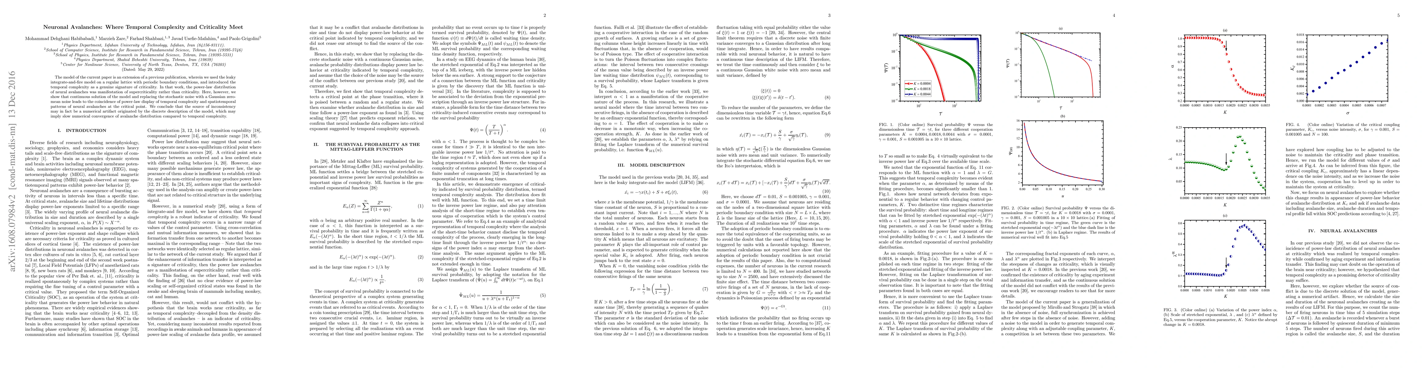 This paper extends a previous model of neural activity, demonstrating that replacing stochastic noise with Gaussian zero-mean noise and using a continuous solution leads to the critical point coinciding with power-law distributions in both temporal complexity and neural avalanches. The authors attribute previous inconsistencies to numerical artifacts from the discrete model description.