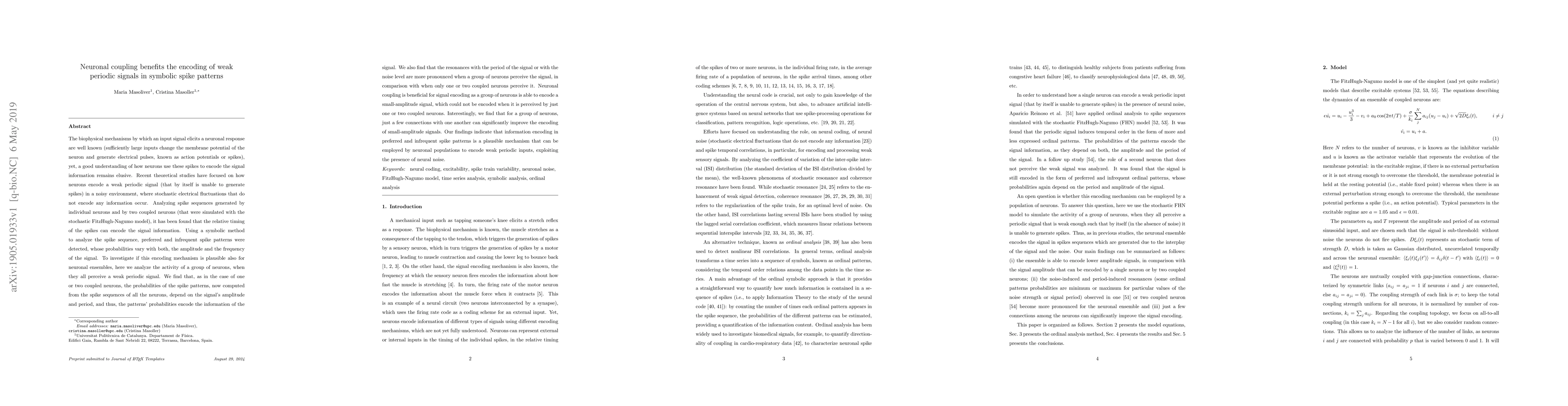 A good understanding of how neurons use electrical pulses (i.e, spikes) to encode the signal information remains elusive. Analyzing spike sequences generated by individual neurons and by two coupled neurons (using the stochastic FitzHugh-Nagumo model), recent theoretical studies have found that the relative timing of the spikes can encode the signal information. Using a symbolic method to analyze the spike sequence, preferred and infrequent spike patterns were detected, whose probabilities vary with both, the amplitude and the frequency of the signal. To investigate if this encoding mechanism is plausible also for neuronal ensembles, here we analyze the activity of a group of neurons, when they all perceive a weak periodic signal. We find that, as in the case of one or two coupled neurons, the probabilities of the spike patterns, now computed from the spike sequences of all the neurons, depend on the signal's amplitude and period, and thus, the patterns' probabilities encode the information of the signal. We also find that the resonances with the period of the signal or with the noise level are more pronounced when a group of neurons perceive the signal, in comparison with when only one or two coupled neurons perceive it. Neuronal coupling is beneficial for signal encoding as a group of neurons is able to encode a small-amplitude signal, which could not be encoded when it is perceived by just one or two coupled neurons. Interestingly, we find that for a group of neurons, just a few connections with one another can significantly improve the encoding of small-amplitude signals. Our findings indicate that information encoding in preferred and infrequent spike patterns is a plausible mechanism that can be employed by neuronal populations to encode weak periodic inputs, exploiting the presence of neural noise.