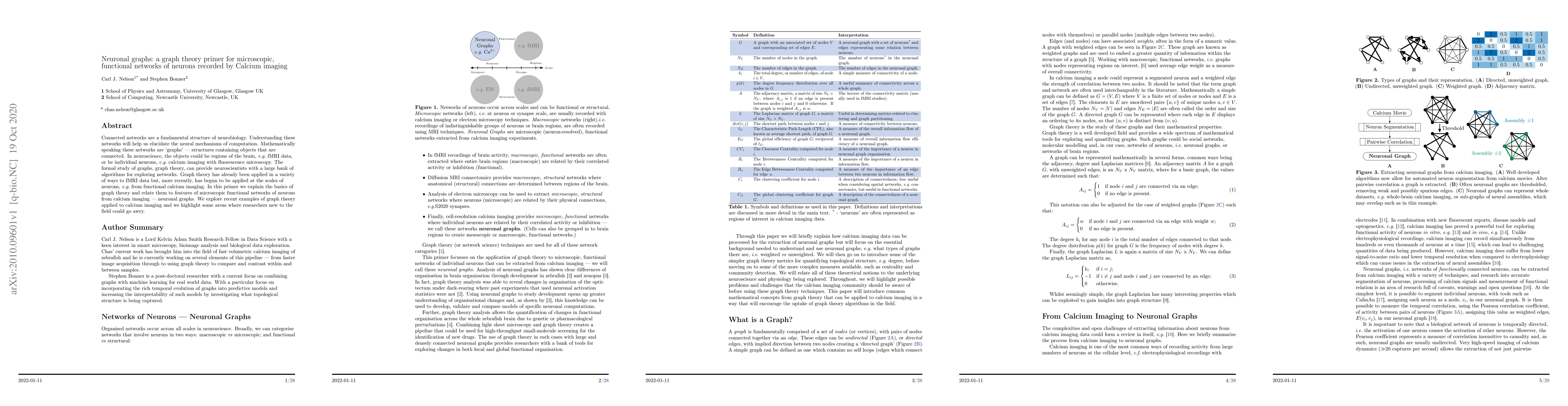 Connected networks are a fundamental structure of neurobiology. Understanding these networks will help us elucidate the neural mechanisms of computation. Mathematically speaking these networks are `graphs' - structures containing objects that are connected. In neuroscience, the objects could be regions of the brain, e.g. fMRI data, or be individual neurons, e.g. calcium imaging with fluorescence microscopy. The formal study of graphs, graph theory, can provide neuroscientists with a large bank of algorithms for exploring networks. Graph theory has already been applied in a variety of ways to fMRI data but, more recently, has begun to be applied at the scales of neurons, e.g. from functional calcium imaging. In this primer we explain the basics of graph theory and relate them to features of microscopic functional networks of neurons from calcium imaging - neuronal graphs. We explore recent examples of graph theory applied to calcium imaging and we highlight some areas where researchers new to the field could go awry.
