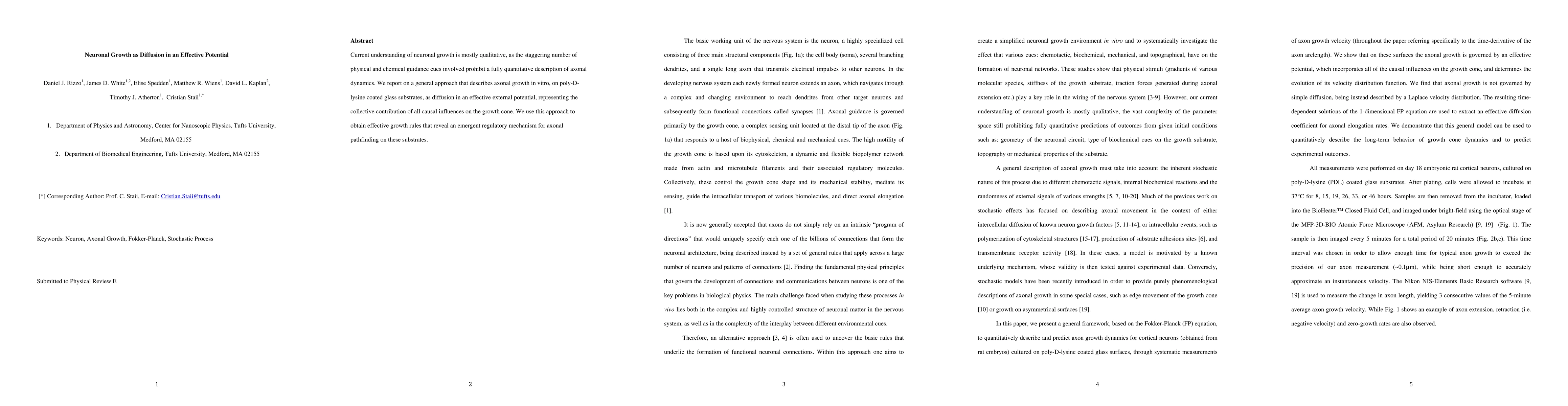 This paper proposes a novel quantitative model describing neuronal growth as diffusion in an effective potential, capturing the collective influence of various guidance cues. The study reveals emergent regulatory mechanisms for axonal pathfinding on poly-D-lysine coated substrates.