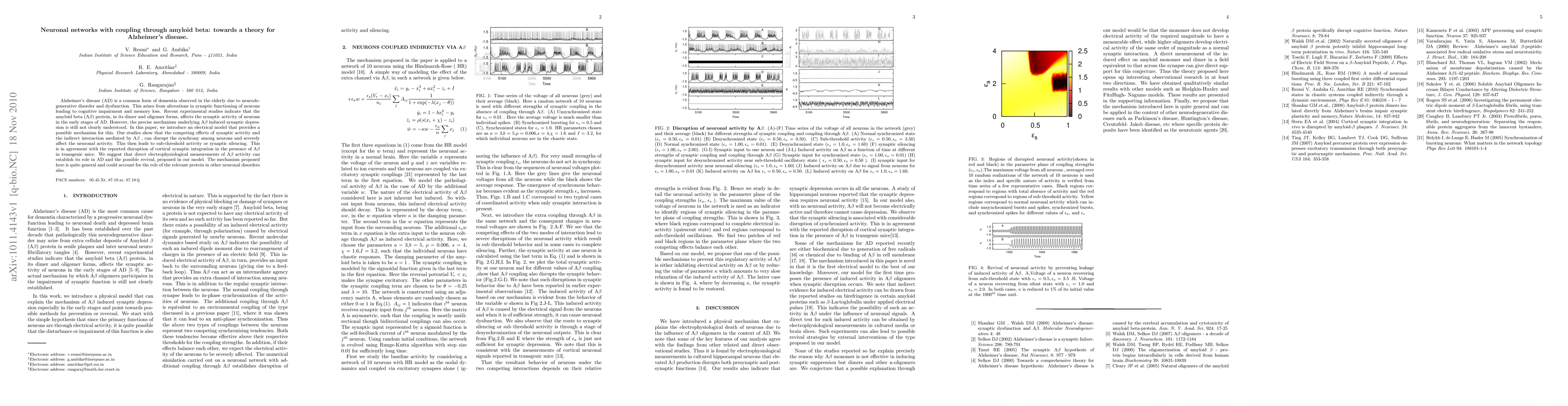 Alzheimer's disease (AD) is a common form of dementia observed in the elderly due to neurodegenerative disorder and dysfunction. This arises from alterations in synaptic functioning of neurons leading to cognitive impairment and memory loss. Recent experimental studies indicate that the amyloid beta (A beta) protein, in its dimer and oligomer forms, affects the synaptic activity of neurons in the early stages of AD. However, the precise mechanism underlying A beta induced synaptic depression is still not clearly understood. In this paper, we introduce an electrical model that provides a possible mechanism for this. Our studies show that the competing effects of synaptic activity and the indirect interaction mediated by A beta, can disrupt the synchrony among neurons and severely affect the neuronal activity. This then leads to sub-threshold activity or synaptic silencing. This is in agreement with the reported disruption of cortical synaptic integration in the presence of A beta in transgenic mice. We suggest that direct electrophysiological measurements of A beta activity can establish its role in AD and the possible revival, proposed in our model. The mechanism proposed here is quite general and could account for the role of the relevant protein in other neuronal disorders also.