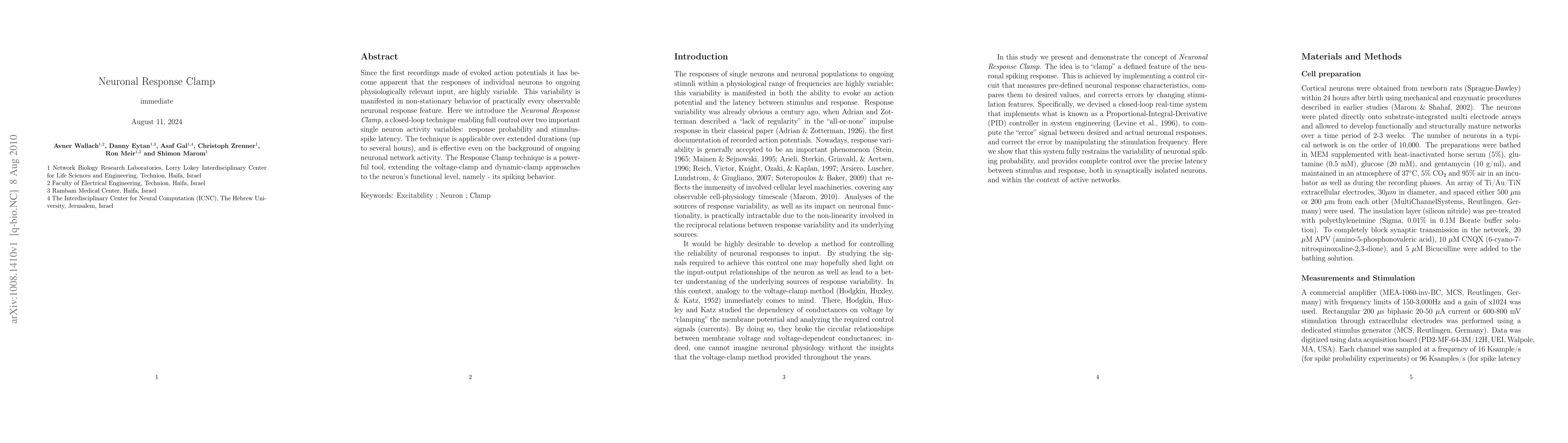 The Neuronal Response Clamp is a novel closed-loop technique that allows precise control over a neuron's response probability and stimulus-spike latency over extended periods, enhancing the study of single neuron activity amidst ongoing network dynamics. This method extends traditional voltage-clamp and dynamic-clamp techniques to the functional level of neuronal spiking behavior.