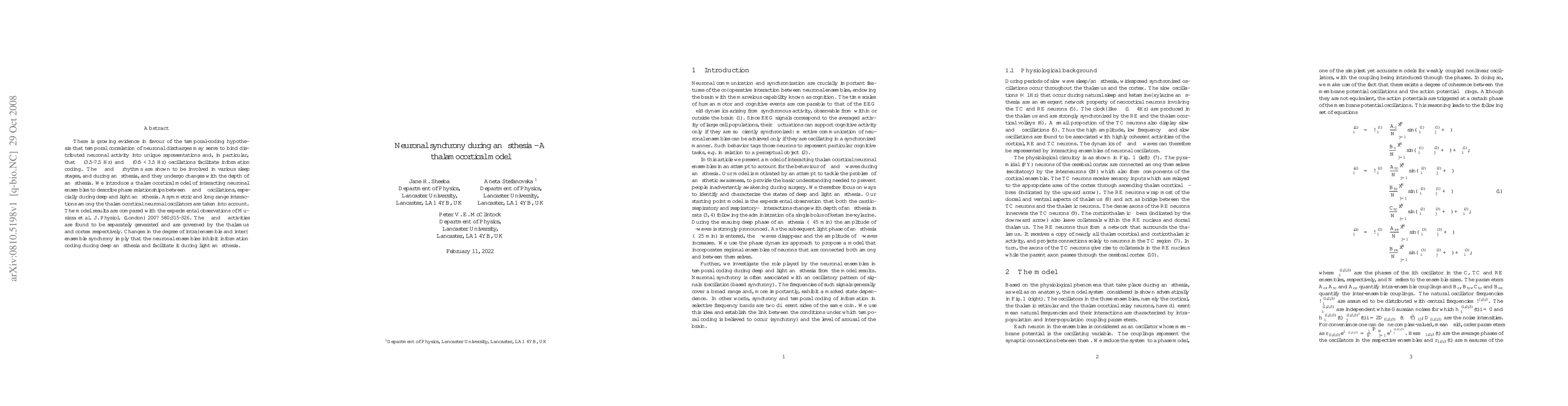 There is growing evidence in favour of the temporal-coding hypothesis that temporal correlation of neuronal discharges may serve to bind distributed neuronal activity into unique representations and, in particular, that $\theta$ (3.5-7.5 Hz) and $\delta$ ($0.5<$3.5 Hz) oscillations facilitate information coding. The $\theta$ and $\delta$ rhythms are shown to be involved in various sleep stages, and during an{\ae}sthesia, and they undergo changes with the depth of an{\ae}sthesia. We introduce a thalamocortical model of interacting neuronal ensembles to describe phase relationships between $\theta$ and $\delta$ oscillations, especially during deep and light an{\ae}sthesia. Asymmetric and long range interactions among the thalamocortical neuronal oscillators are taken into account. The model results are compared with the experimental observations of Musizza et al. {\it J. Physiol. (London)} 2007 580:315-326. The $\delta$ and $\theta$ activities are found to be separately generated and are governed by the thalamus and cortex respectively. Changes in the degree of intra--ensemble and inter--ensemble synchrony imply that the neuronal ensembles inhibit information coding during deep an{\ae}sthesia and facilitate it during light an{\ae}sthesia.