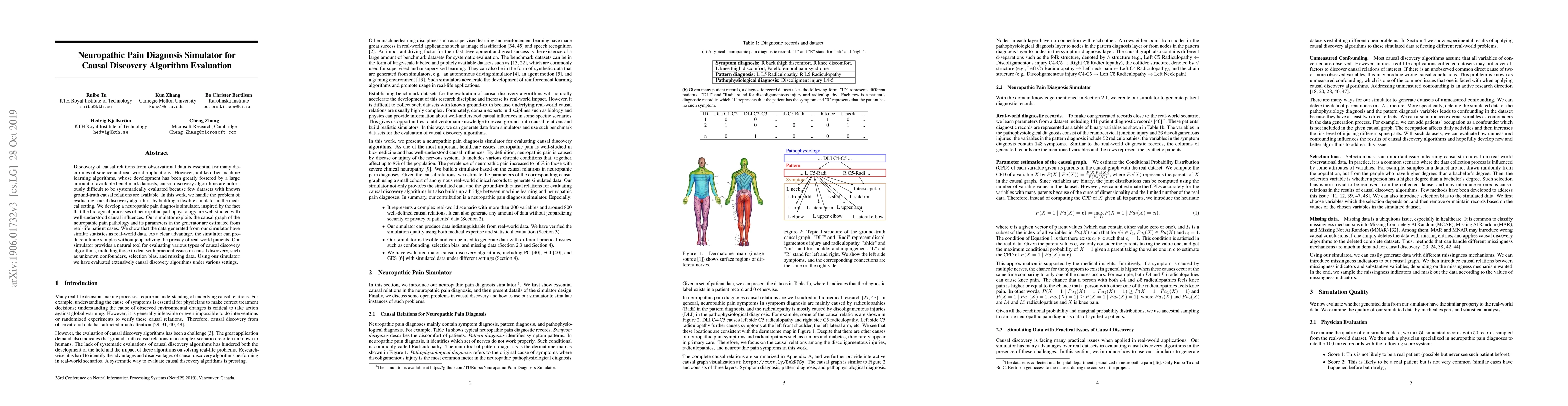 This paper introduces a simulator for evaluating causal discovery algorithms in the context of neuropathic pain diagnosis, leveraging well-understood biological causal influences. The simulator generates data that mimics real-world statistics, allowing for extensive evaluation of causal discovery methods under various practical challenges.