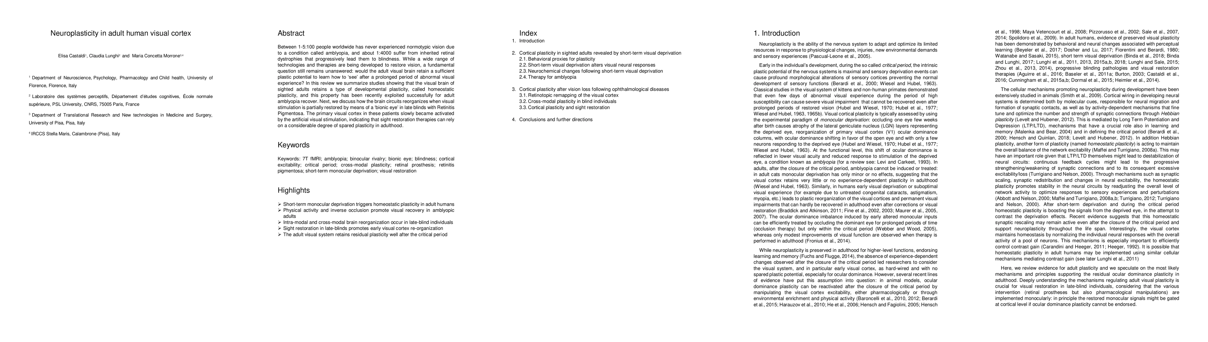 The adult human brain retains plastic potential to learn new visual experiences, even after prolonged periods of abnormal vision, allowing for some sight restoration therapies to be effective. This property, known as homeostatic plasticity, enables the primary visual cortex to reorganize and become activated by artificial stimulation in patients with visual impairments.